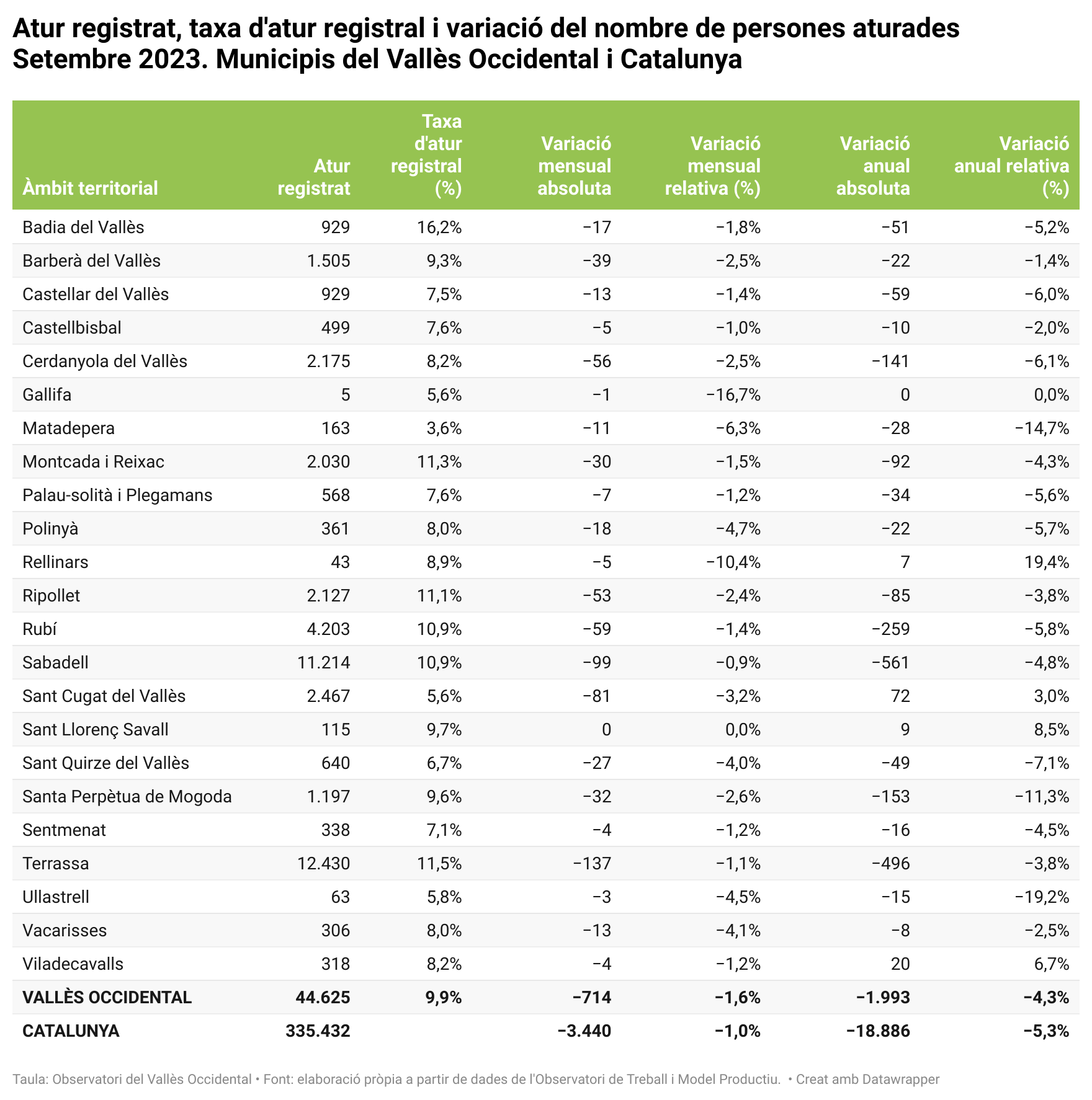 En total, setembre de 2023 ha finalitzat amb 44.625 persones aturades registrades al Vallès Occidental. Respecte a l’agost, l’atur ha disminuït un 1,6%, unes 714 persones aturades menys. La taxa total d’atur a la comarca se situa en el 9,9%, unes 1.993 persones menys que l’any passat.