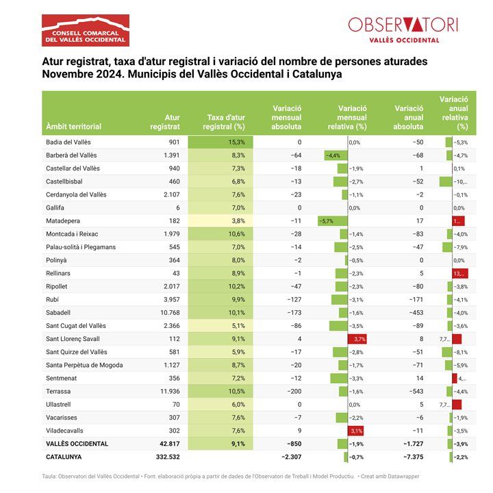 Aquest mes de novembre ha estat força bo a gran part de la comarca. Actualment, al Vallès Occidental hi ha 42.887 persones aturades, el que suposa 850 menys que les que hi havia el mes d’octubre (-1,9%). En el conjunt del territori, hi ha 18 municipis on el nombre de desocupats ha disminuït mentre que només ha pujat a dos; Sant Llorenç Savall i Viladecavalls.