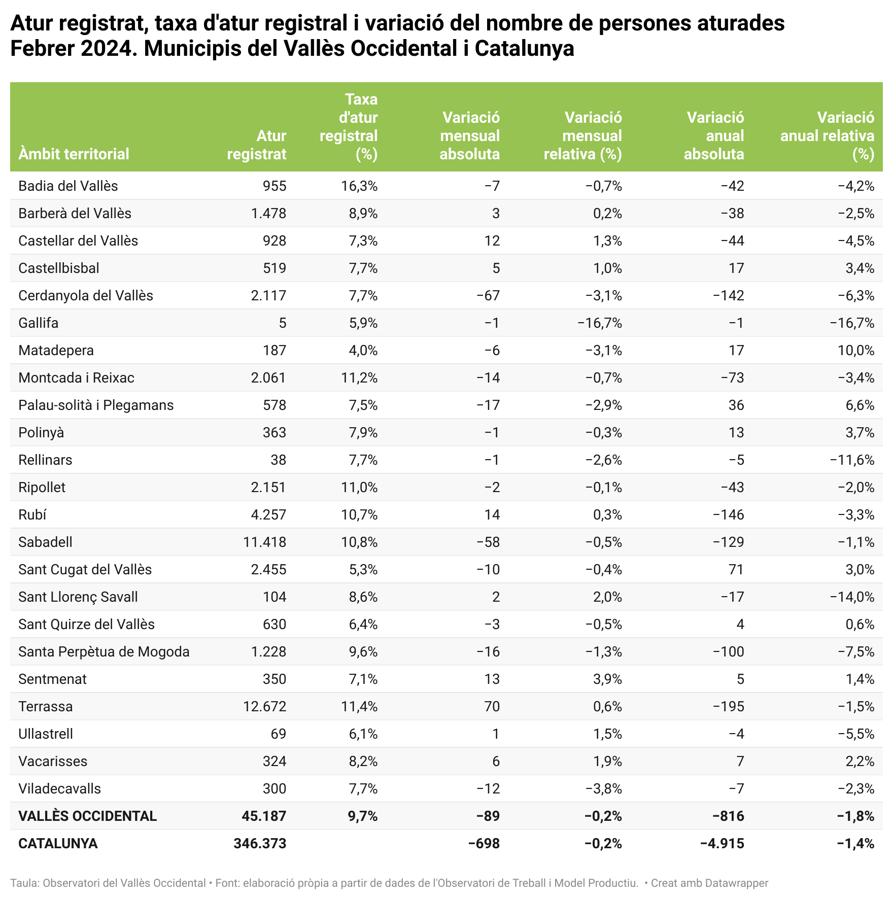 Les xifres del nostre municipi són semblants a les de Castellar del Vallès (1,3%), Ullastrell (1,5%) i Vacarisses (1,9%), on la variació mensual relativa ha augmentat, però no supera el 2% com si ho fa a Sant Llorenç de Savall (2%) o a Sentmenat (3,9%). Un cas que cal destacar és el de Terrassa. La cocapital del Vallès Occidental, malgrat presentar una variació mensual del 0,6%, és el municipi de la comarca on més persones s’han quedat sense feina durant el mes de febrer. En total, hi ha unes 70 persones més desocupades més.