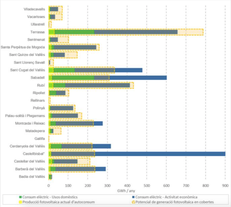 Mitjançant aquest mapa, elaborat per l’Oficina Comarcal de Transició Energètica coincidint amb el Dia Mundial de l’Energia, es pot consultar i comparar el potencial de generació solar fotovoltaica de les cobertes dels edificis i el consum elèctric anual a nivell de municipi. Clicant sobre cada municipi es desplega una taula on es pot consultar la seva població, el seu consum elèctric anual, la potència fotovoltaica instal·lable en cobertes i la seva producció anual, com també quin percentatge de la demanda elèctrica es podria cobrir amb aquesta producció.
