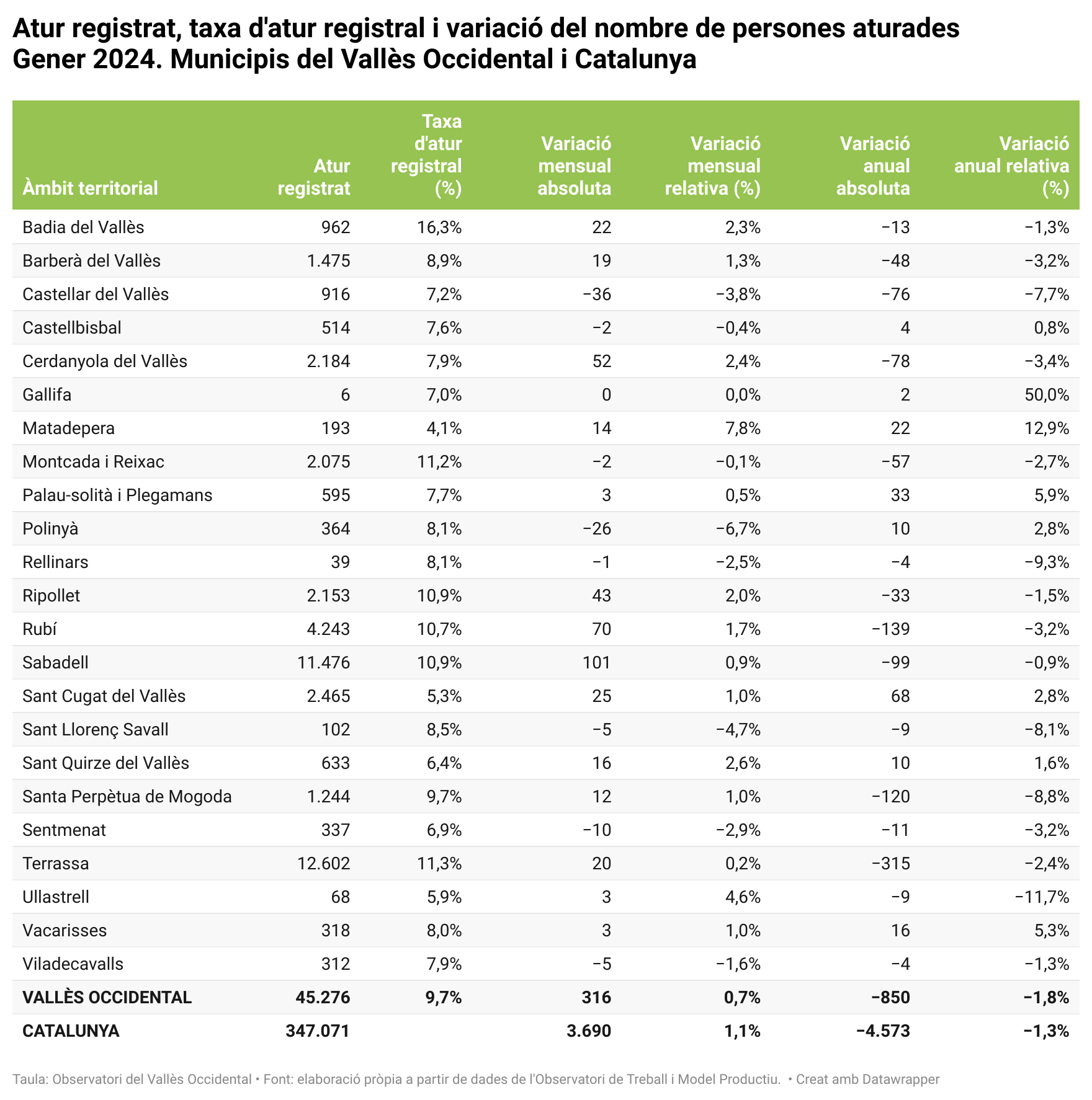 Pel que fa a les dades de la totalitat del Vallès Occidental, la comarca comença l’any amb 45.276 persones aturades. Respecte al mes de desembre, l’atur ha augmentat un 0,7%, unes 316 persones desocupades més en nombres absoluts. D’aquesta manera, la comarca ja encadena dos mesos consecutius de pujades. Tot i això, hi ha 850 persones desocupades menys que el gener de 2023.