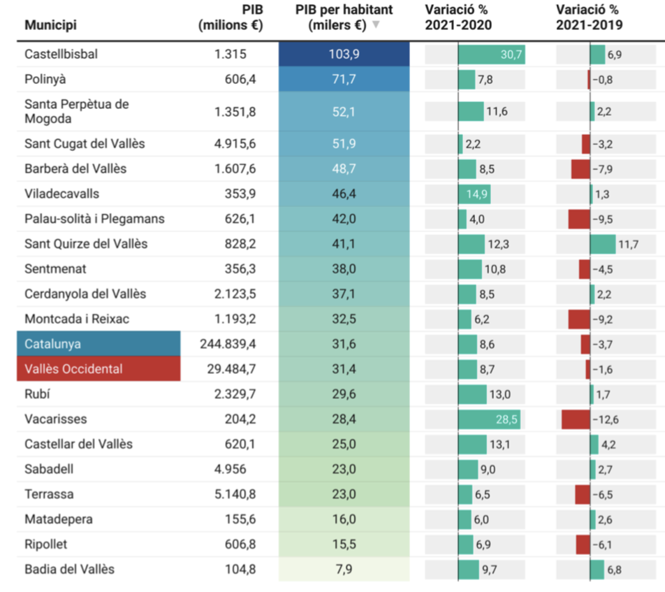 Dels dinous municipis de més de 5.000 habitants de la comarca, tots ells han presentat creixements del PIB per habitant respecte a l’any 2020, però només deu han obtingut xifres superiors al 2019. En aquest sentit, juntament amb Castellbisbal, destaquen el cas de Sant Quirze del Vallès (+11,7%), Badia del Vallès (+6,8%) i Castellar del Vallès (+4,2%).
