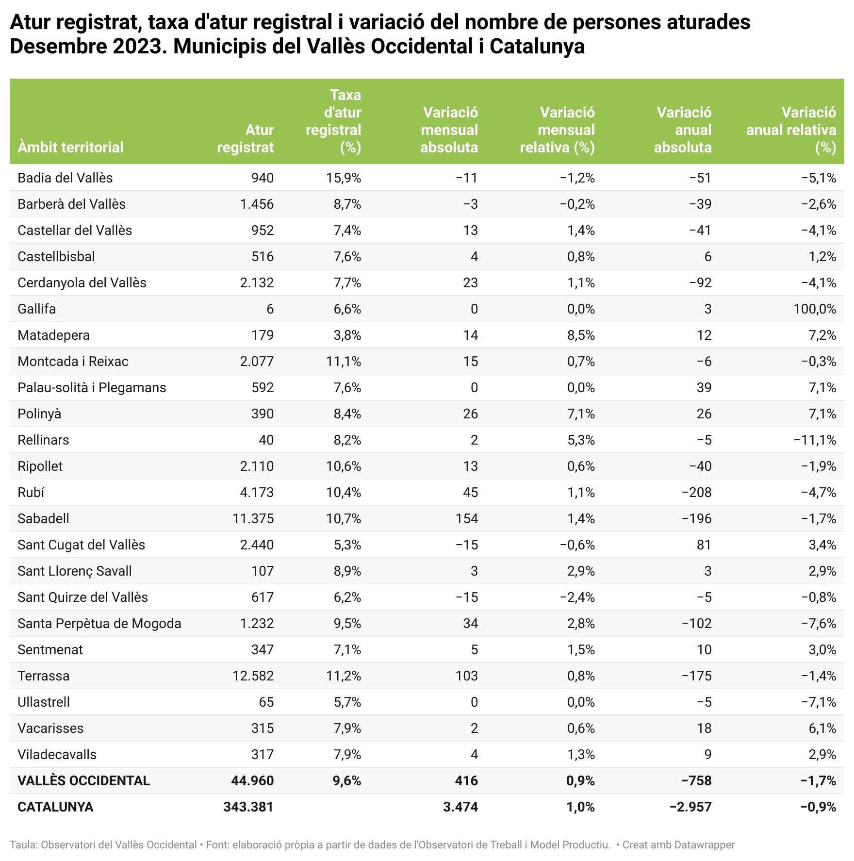 Pel que fa a les dades de la totalitat del Vallès Occidental, la comarca tanca l’any amb 44.960 persones aturades. Respecte del novembre, l’atur ha augmentat un 0,9%, unes 416 persones desocupades més en nombres absoluts. Tot i això, hi ha 758 persones desocupades menys que el desembre de 2022.
