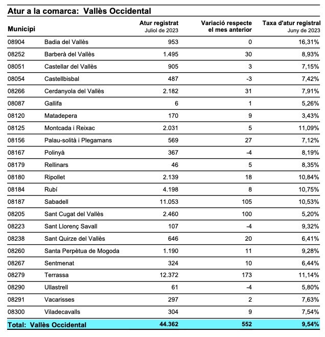 Al Vallès Occidental ha estat un mal mes en línies generals. En termes absoluts, s’han apuntat al SOC un total de 552 persones, el que deixa la xifra de desocupats a la comarca en 44.365. Dels 23 municipis, l’atur ha apujat en 18, 1 s’ha mantingut igual i només en quatre (4), ha baixat. Així, a Terrassa la situació no ha estat bona, i l’increment ha estat de 173 persones, deixant la xifra global en 12.372 egarencs sense feina. Sabadell i Sant Cugat del Vallès han estat els altres dos municipis on la pujada ha estat forta.