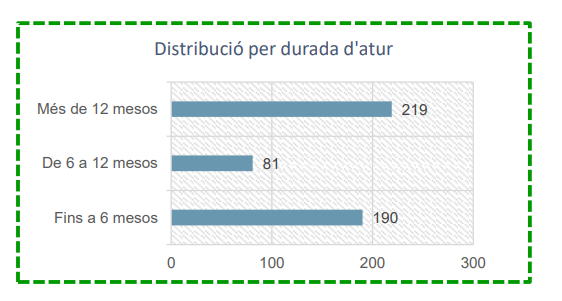 Quant a la durada de l’atur, i seguint la tendència dels mesos anteriors, les persones en situació de desocupació des de fa més de dotze mesos són el grup més gran, amb un total de 219 aturats, seguit de les que porten menys temps -inferior a sis mesos- amb 190 persones i tancant el rànquing amb els aturats de durada intermèdia, entre sis mesos i un any, que són 81.