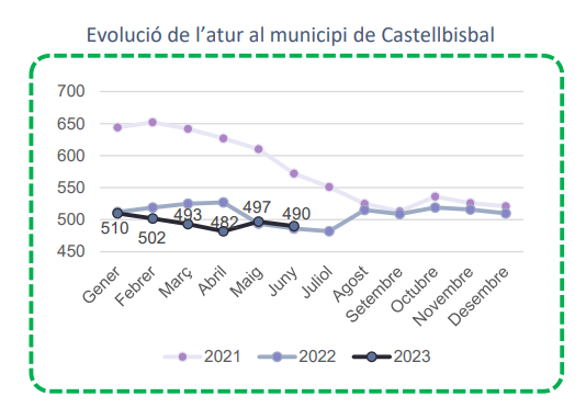 Les dades d’atur del mes de juny a Castellbisbal reflecteixen una lleugera davallada, amb un total de 490 persones sense feina, 7 menys que el mes de maig, el que suposa una variació mensual del -1,4%.