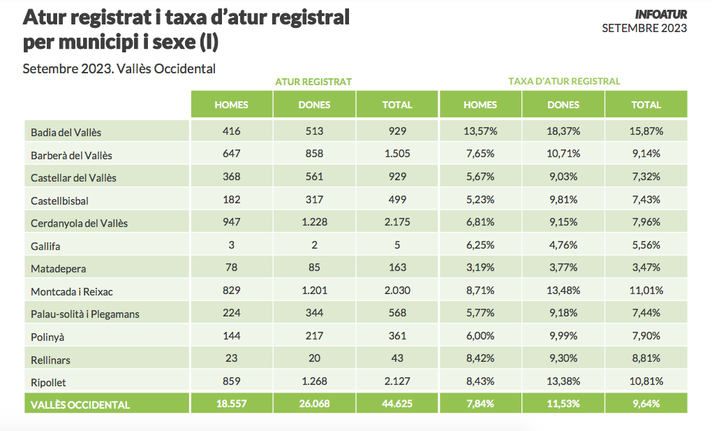 Tot i aquestes dades, el mes de setembre l’atur es va reduir un 1% a Castellbisbal respecte a l’agost. A la totalitat del Vallès Occidental, la desocupació s’ha reduït en totes les franges d’edat, tret de la del col·lectiu de menors de 30 anys, on ha augmentat un 2,1%. El descens de l’atur ha estat notable en el cas de les persones de 30 a 44 anys (-4,5%) i de 45 a 54 anys (-2,1%). En el cas dels majors de 55 anys, el col·lectiu amb més aturats del municipi, l’atur només s’ha reduït un 0,3%.