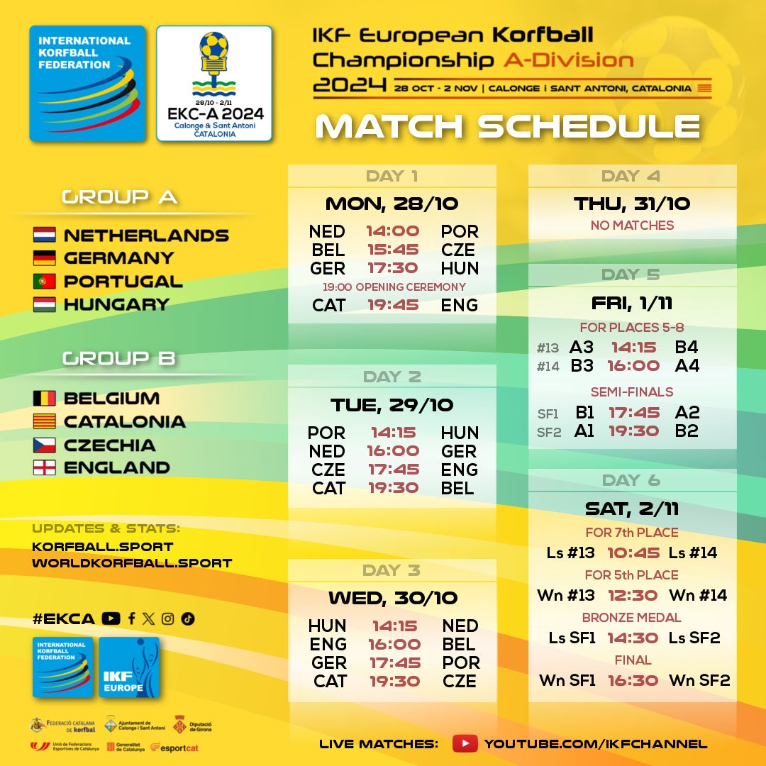 Aquesta setmana la Federació Internacional de Korfbal (IKF) ha fet públic el calendari de joc del Campionat d’Europa de Korfbal “A” 2024 que es jugarà a Calonge i Sant Antoni del 28 d’octubre al 2 de novembre. Durant aquesta competició, Catalunya actuarà com a amfitriona i competirà contra les 8 millors seleccions d’Europa.