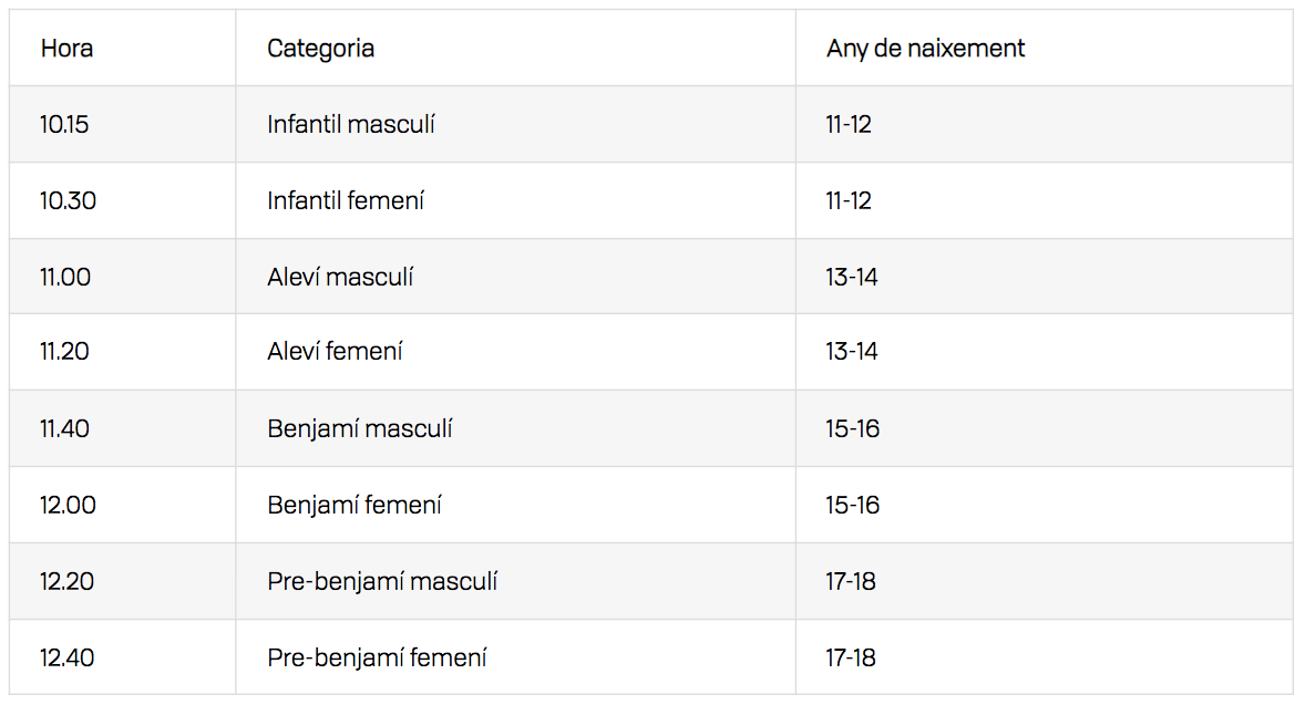 Com cada edició, la cursa disposarà de diverses categories segons l’edat dels participants. Aquestes són Pre-benjamí, Benjamí, Aleví i Infantil. Cadascuna d’aquestes categories tindrà una distància de recorregut diferent i un horari de sortida determinat. A continuació us deixem una taula proporcionada per l’Illa Esportiva de Castellbisbal on podeu consultar els horaris de cadascuna de les curses i les edats dels seus participants.