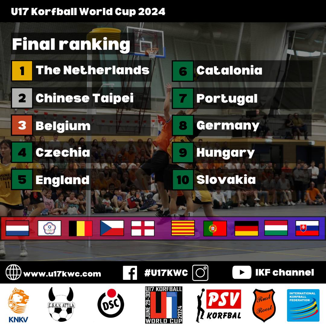 La 1a posició d’aquesta Copa del Món Sub-17 d’enguany va ser per l’amfitriona, la selecció de Països Baixos. Els neerlandesos es van emportar el títol de campions després de derrotar a la vigent campiona, la Xina Taipei, a la gran final. Bèlgica es va alçar amb el bronze i Txèquia es va quedar a les portes del podi en quarta posició. La cinquena posició va ser Anglaterra, la sisena per Catalunya, la setena per Portugal, la vuitena per Alemanya, la novena per Hongria i la desena per Eslovàquia.