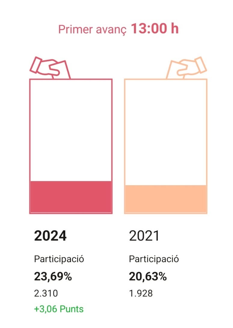 Cal recordar que aquesta xifra no inclou els vots que s’han registrat per correu, ja que aquests vots s’afegiran a les vuit del vespre quan tanquin els col·legis electorals.