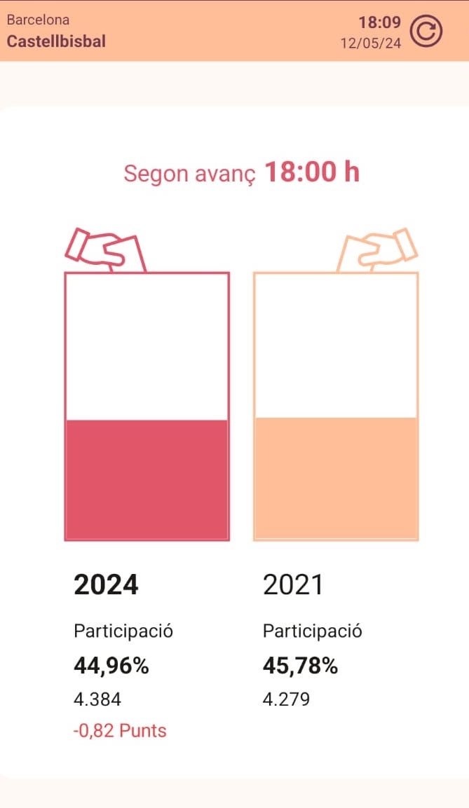 Un total de 4.384 castellbisbalencs han passat per les urnes a Castellbisbal, el que suposa un 44,96% del totals dels electors que estan cridats a les urnes aquest diumenge 12 de maig de 2024, segons les dades de l’avenç de participació de la Generalitat de Catalunya fins a les 18:00h. Aquesta xifra suposa una petita caiguda de 0,82 punts respecte les dades de participació en les eleccions generals del 2021 a aquesta mateixa hora, quan havien participat els 45,78% dels electors amb un total de 4.279 vots. Així doncs, malgrat que el percentatge ha caigut enguany, han votat unes cent persones més que durant el segon balanç del 2021.