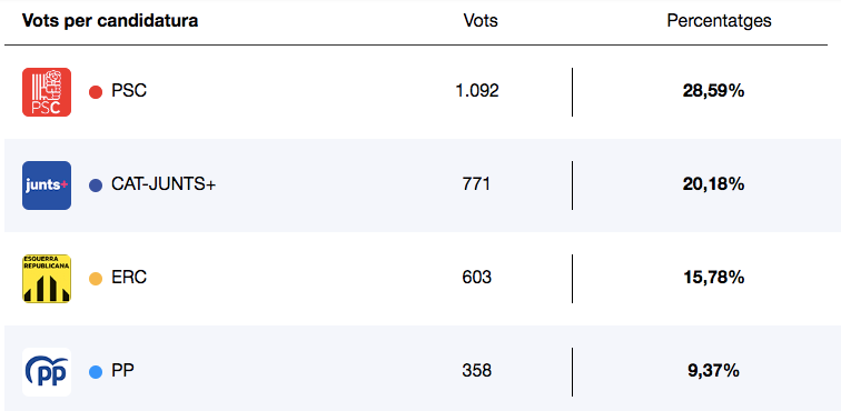 Aquest diumenge, 12 de maig, s’han celebrat les eleccions al Parlament de Catalunya 2024. Gràcies a l’aplicació creada per la Generalitat de Catalunya per a l’ocasió, podem saber amb exactitud quins han estat els resultats dels tres col·legis electorals de Castellbisbal. En aquest sentit, a continuació us explicarem quines han estat les formacions polítiques més votades al poliesportiu de l’Escola Mare de Déu de Montserrat.