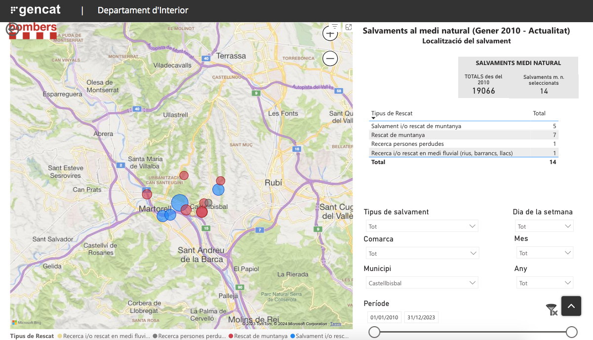Si ampliem el visor a la comarca, aquest any passat es van executar 94 actuacions vinculades a aquesta categoria, destacant el rescat o auxili a la muntanya amb 72. Amb molta diferència, és a Matadepera on es van dur la major part d’aquest tipus de serveis. Fins a 17, repartits en serveis de rescat de muntanya (14), acompanyament de persones perdudes (2), i recerca de persones perdudes o desaparegudes (1). Els dissabtes van ser els pitjors dies pels Bombers que donen cobertura a aquest municipi, perquè és quan es concentren la major part dels serveis (7 dels 17). Tanmateix, hi ha hagut un lleu descens d’actuacions respecte a l’any 2022, quan en van ser 19.