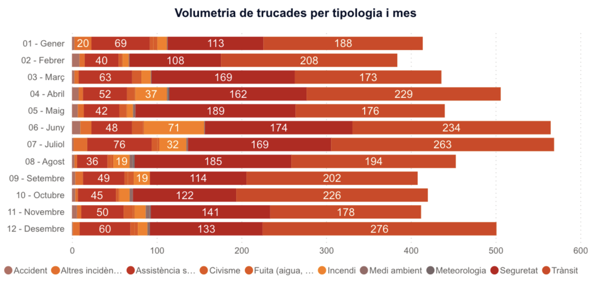 Pel que fa als mesos en què es van produir més trucades al telèfon d’emergències, juliol va tornar a ser el més amb major volum de trucades amb 569. D’aquestes, unes 263 van ser per trànsit, 168 per incendis, 76 per assistència sanitària i 32 per incendis. El segon mes amb més trucades és juny (565), seguit d’abril (506), desembre (501) i agost (453). Si comparem aquestes xifres amb les del 2023, observem que Juliol també va registrar el el major nombre de trucades al 112, amb 622.