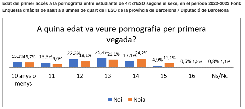 Pel que fa a l’edat del primer accés a la pornografia, entre els alumnes de 4t d’ESO que admeten haver vist aquests continguts alguna vegada el 47,5% ho ha fet abans dels 12 anys (50,9% en el cas dels nois). Als 13 anys, el percentatge arriba al 71,8% (76,3% en el cas dels nois). Entre els més precoços, destaca que un 14,5% ha vist pornografia per primera vegada amb 10 anys o menys, un 33,5% en la franja d’11 a 12 anys i un 43% en la franja 13 a 14 anys.