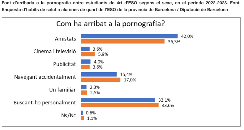 Pel que fa a com han conegut els continguts pornogràfics, aquest és similar entre els dos sexes, però amb lleugeres diferències. 4 de cada 10 adolescents (40,3%) arriba a la pornografia a través de les amistats, percentatge lleugerament més elevat entre els nois (42%) que entre les noies (36,3%). El 30% busca pornografia personalment, i al voltant del 15% explica que s’ho ha trobat accidentalment navegant per internet. En percentatges molt més petits, un 5% dels alumnes afirma que ha arribat a la pornografia a través del cinema i les sèries, un 4% explica que ha vist publicitat sobre pornografia i només un 2% afirma que ha conegut l’ha conegut a través d’un familiar.