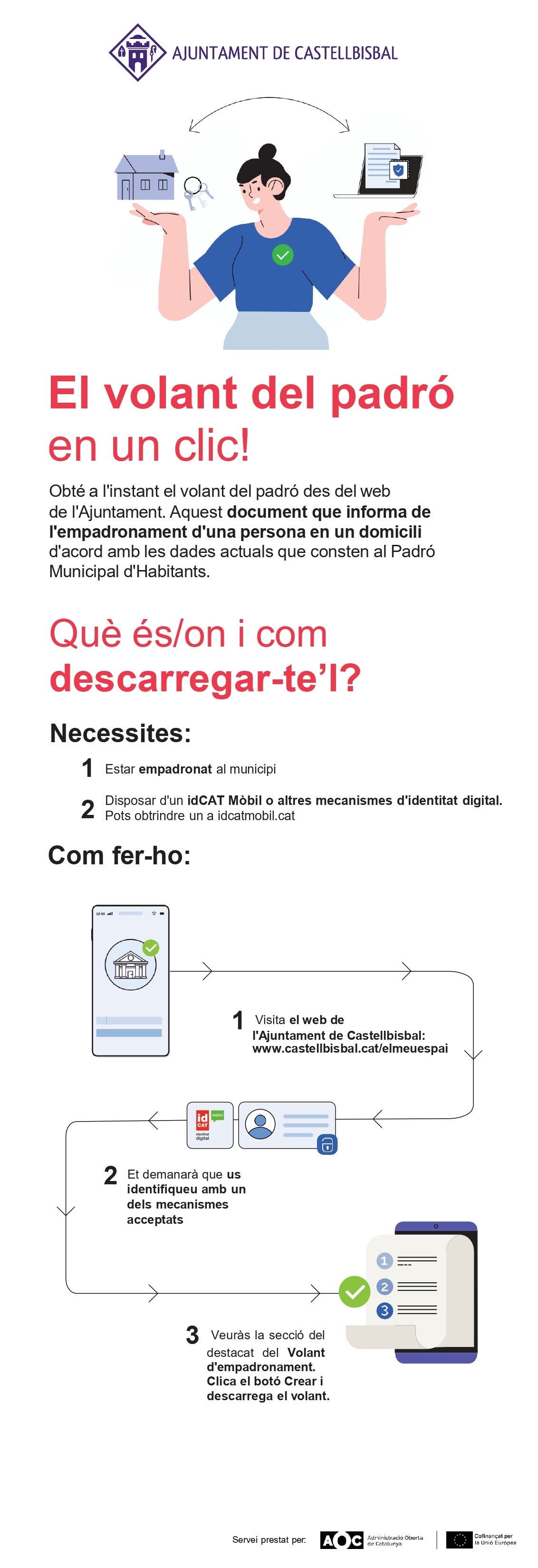 L’Ajuntament de Castellbisbal oferirà a partir d’ara la possibilitat d’obtenir el volant d’empadronament de manera telemàtica i immediata. Aquesta nova funcionalitat, impulsada pel Consorci d’Administració Oberta de Catalunya (AOC), permet a qualsevol persona empadronada al municipi castellbisbalenc accedir a les seves dades acreditatives de residència i descarregar el seu volant d’empadronament de manera ràpida i senzilla. En aquest sentit, des de l’Ajuntament destaquen que aquesta funcionalitat “facilitarà un dels tràmits més sol·licitats per la ciutadania, reduint la necessitat de gestions presencials i agilitzant el servei”.