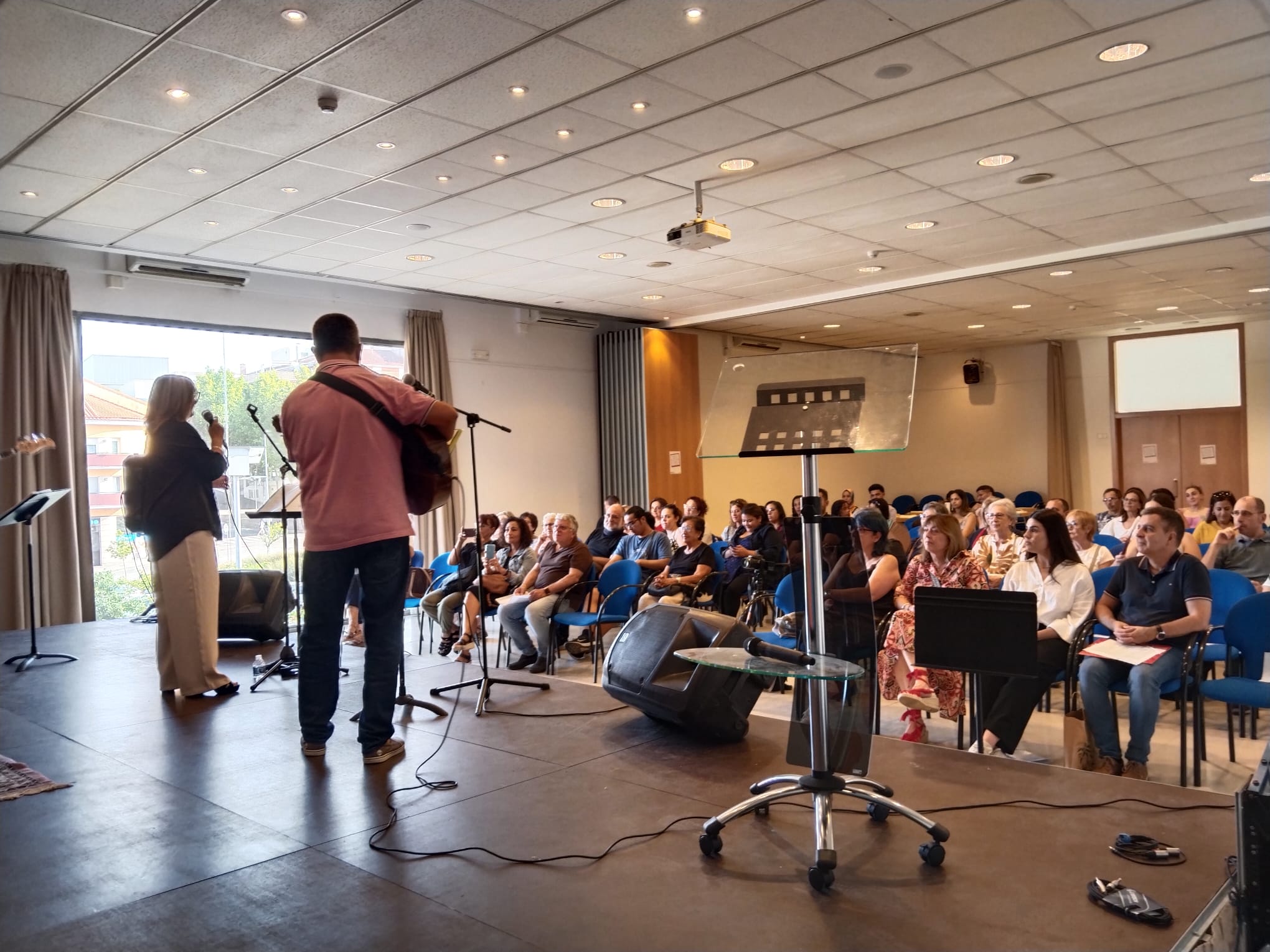 La jornada va començar amb el relat de cinc testimonis que han participat en els cursos de l’Oficina de Català de Castellbisbal d’enguany; concretament tres alumnes, una voluntària i una aprenenta. Tots cinc van explicar les seves vivències i emocions durant el curs i tot allò que els ha aportat aquesta experiència. A continuació, el grup musical ‘Jes’; format pel Joan, l’Ernest, el Quim i la Sílvia, van amenitzar la cita amb algunes cançons en català. Finalment, la celebració va acabar amb una foto de grup i un refrigeri entre tots els assistents, un espai que també va servir de conversa i d’intercanvi de sensacions.