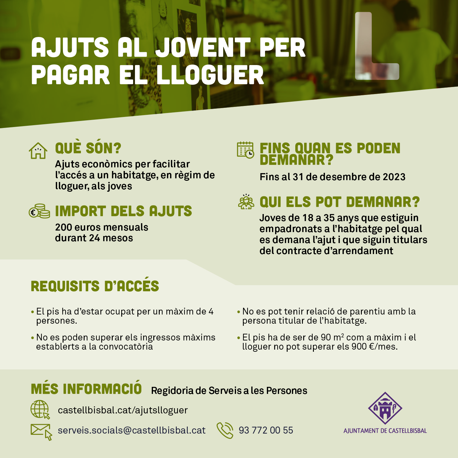L’Ajuntament de Castellbisbal atorga una subvenció econòmica per facilitar l’accés a un habitatge, en règim de lloguer, als joves d’entre 18 i 35 anys de Castellbisbal. La convocatòria per sol·licitar els ajuts es va obrir a inicis d’any i romandrà oberta fins al dia 31 de desembre.