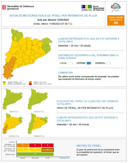 El Servei Meteorològic de Catalunya ha emès un avís de situació meteorològica de perill per intensitat de pluja a Castellbisbal i tota la comarca del Vallès Occidental. Es preveu que aquest dimarts, dia 12 de setembre, hi hagi possibilitat de xàfecs intensos amb tempesta, a més de possible temps violent. L’afectació serà a gran part del territori i es podran superar els 20l/m2 en 30 minuts. Al Vallès Occidental, el perill és de 3 sobre 6. L’episodi s’iniciaria a partir de les dotze del migdia i tindrem precipitacions fins a la matinada.
