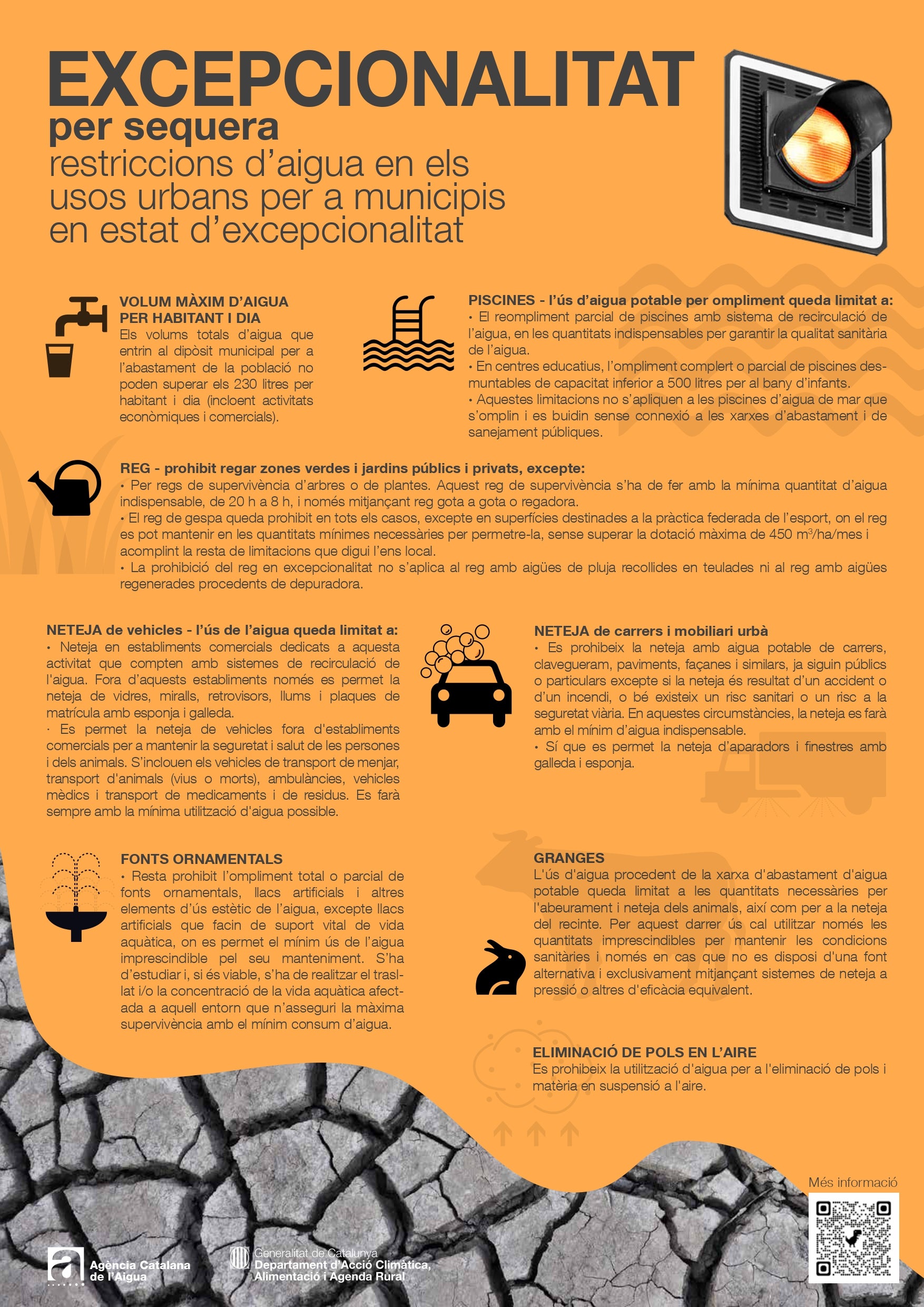 Podeu veure la resta de mesures en aquest pòster. Les mesures específiques per piscines, les trobareu aquí. A més, al web de la Generalitat de Catalunya podeu consultar totes les preguntes freqüents sobre les limitacions i mesures que s’han de prendre a causa de la sequera.