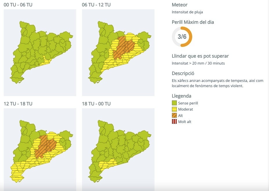 Meteocat informa que serà d’intensitat entre feble i moderada, però que podria anar acompanyada localment de tempesta i de fenòmens de temps violent. S’acumularan quantitats entre minses i poc abundants, localment abundants o molt abundants.