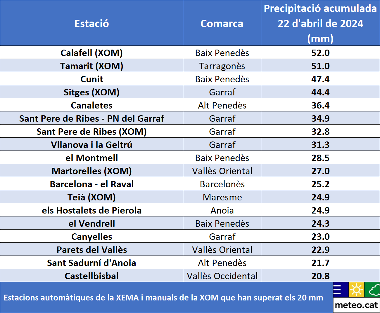 Malgrat situar-se en el top 1 de la comarca, les pluges a Castellbisbal van quedar lluny dels grans ruixats que es van detectar a altres indrets de Catalunya. Destaquen, per exemple, els 52 mm acumulats de Calafell o els 51 mm de Tamarit. Si observem les dades del Meteocat, també veiem que el Baix Penedès va ser la comarca amb més ruixats durant el dia d’ahir, amb quatre municipis per sobre dels 22 mm de pluja acumulada (Calafell, Cunit, el Montmell i el Vendrell).