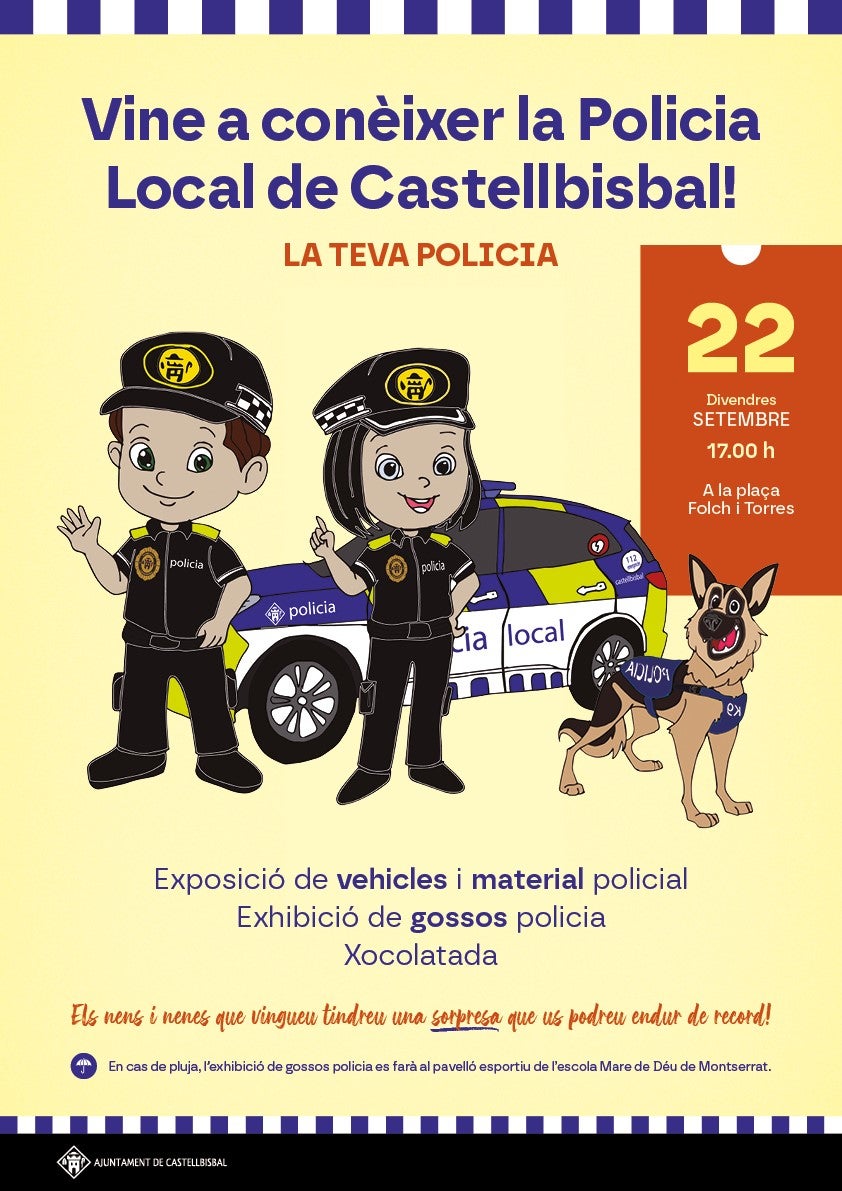 El pròxim divendres 22 de setembre l’Ajuntament de Castellbisbal ha organitzat un acte orientat als infants per tal que coneguin la policia local del municipi. L’esdeveniment, que tindrà lloc a la plaça Folch i Torres, començarà a les 17:00 hores i comptarà amb la participació de diversos agents. Els més petits, podran aprendre en què consisteix la feina d’un policia local i conèixer quines eines i material utilitzen en el dia a dia. A més, tots els nens i nenes que hi assisteixin tindran una sorpresa que es podran endur de record a casa.