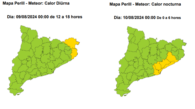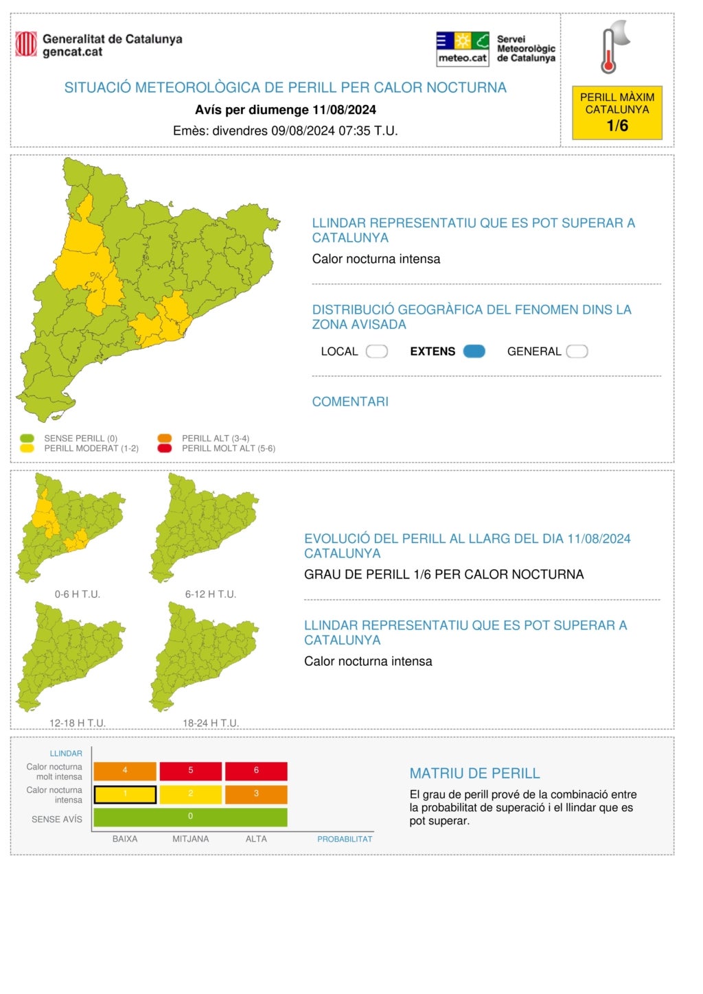 La calor però no s’acabarà aquí. Aquest divendres, Meteocat ha activat un segon avís per forta calor nocturna que tindrà lloc la matinada de diumenge dia 11 d’agost, que afectaria la nostra comarca i les de més al litoral. Estaria focalitzada entre les 12 de la mitjanit i les 6 de la matinada, amb un grau de perill d’1 sobre 6.