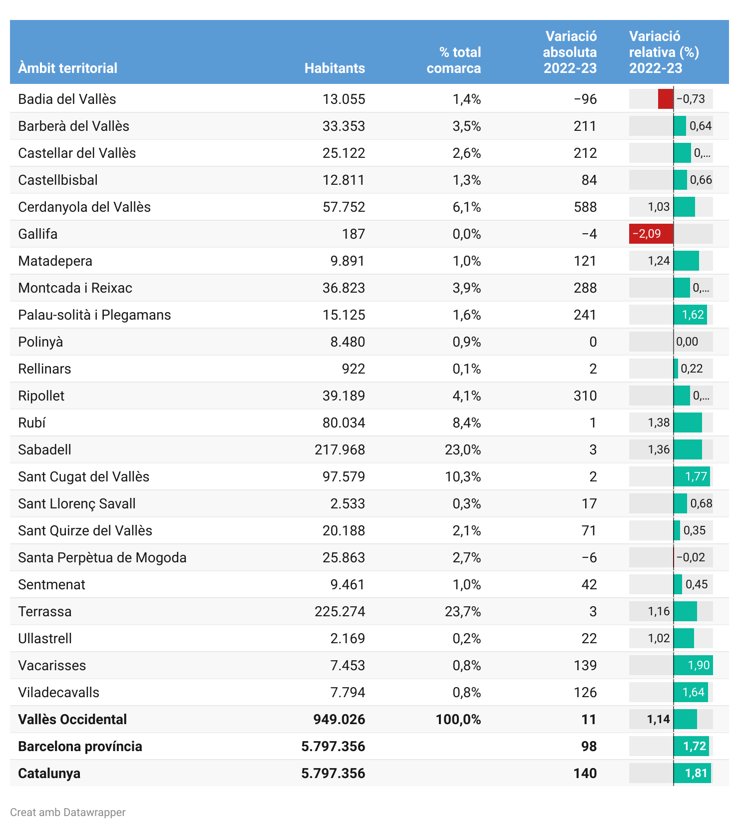 Entre els municipis que augmenten de manera més notable la seva població, destaquen Vacarisses (+1,90% i 139 persones més residents), Sant Cugat del Vallès (+1,77%), Viladecavalls (+1,64% amb 126 persones més al padró) i Palau-solità i Plegamans (+1,62% amb 241 persones més). Polinyà és l’únic municipi que no ha patit cap variació poblacional aquest 2023 (0% de creixement).