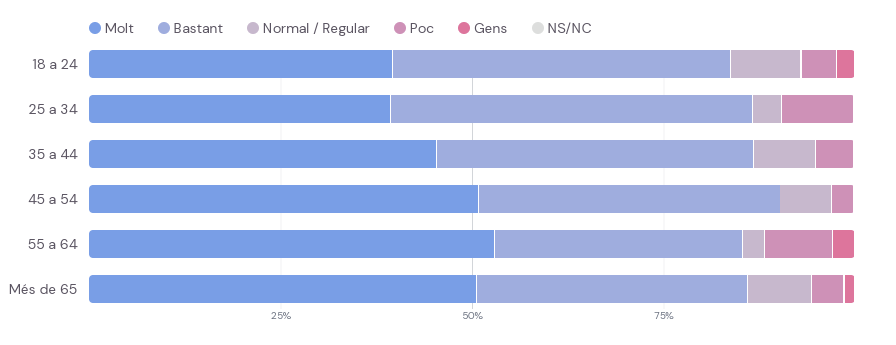 Pel que fa als nivells de satisfacció segons l’edat, el col·lectiu d’entre 55 i 64 anys és el que més satisfacció va mostrar amb un 53% afirmant estar ‘molt satisfets’ de viure a Castellbisbal. El segueixen de prop els veïns d’entre 45 i 54 anys (amb un 50,9%) i els majors de 65 anys (amb un 50,7%). Els grups que menys satisfacció mostren són els joves d’entre 18 i 24 anys, amb un 39,7% ‘molt satisfets’, i els de 25 a 34 anys, amb 39,5%. Tot i això, cal destacar que en totes les franges d’edat les respostes de ‘molt’ o ‘bastant’ sumades superen el 75% dels resultats, mentre que el ‘poc’ o el ‘gens’ quasi no superen el 10%.