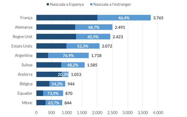 De les 25.628 persones de la comarca que resideixen a l’estranger, la majoria ho fan a altres països europeus, tot i que en el rànquing també s’hi troben països del continent americà. Al gràfic, elaborat per l’Observatori del Consell Comarcal del Vallès Occidental, es diferencien les dades entre les persones nascudes a Espanya i les nascudes a la resta del món: