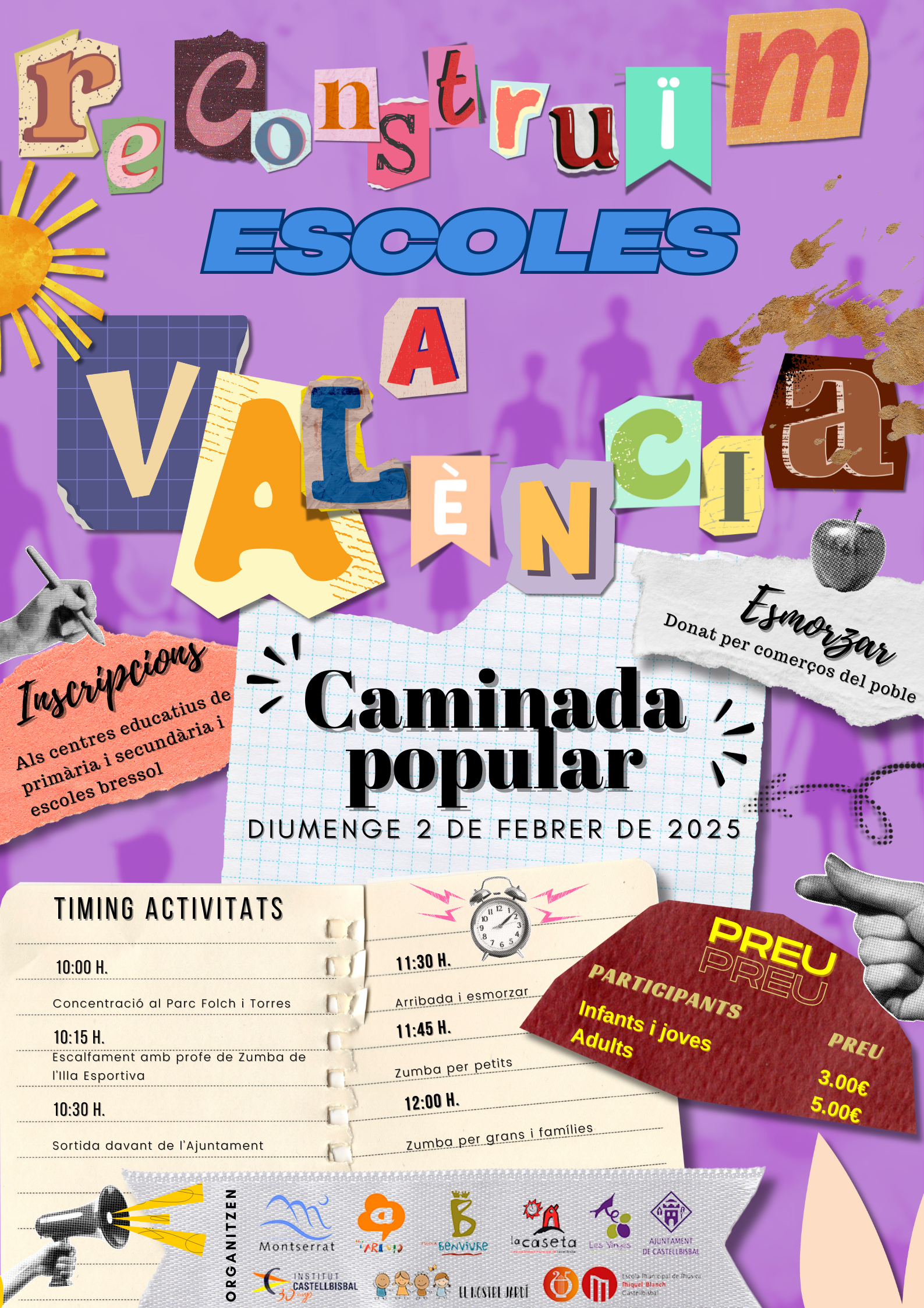 El pròxim diumenge, 2 de febrer, s’organitzarà a Castellbisbal una caminada popular de caire familiar per recollir diners i donar suport a la reconstrucció de les escoles valencianes que han estat víctimes de la devastació causada per la DANA. Aquesta iniciativa està impulsada conjuntament entre tots els centres educatius del municipi.