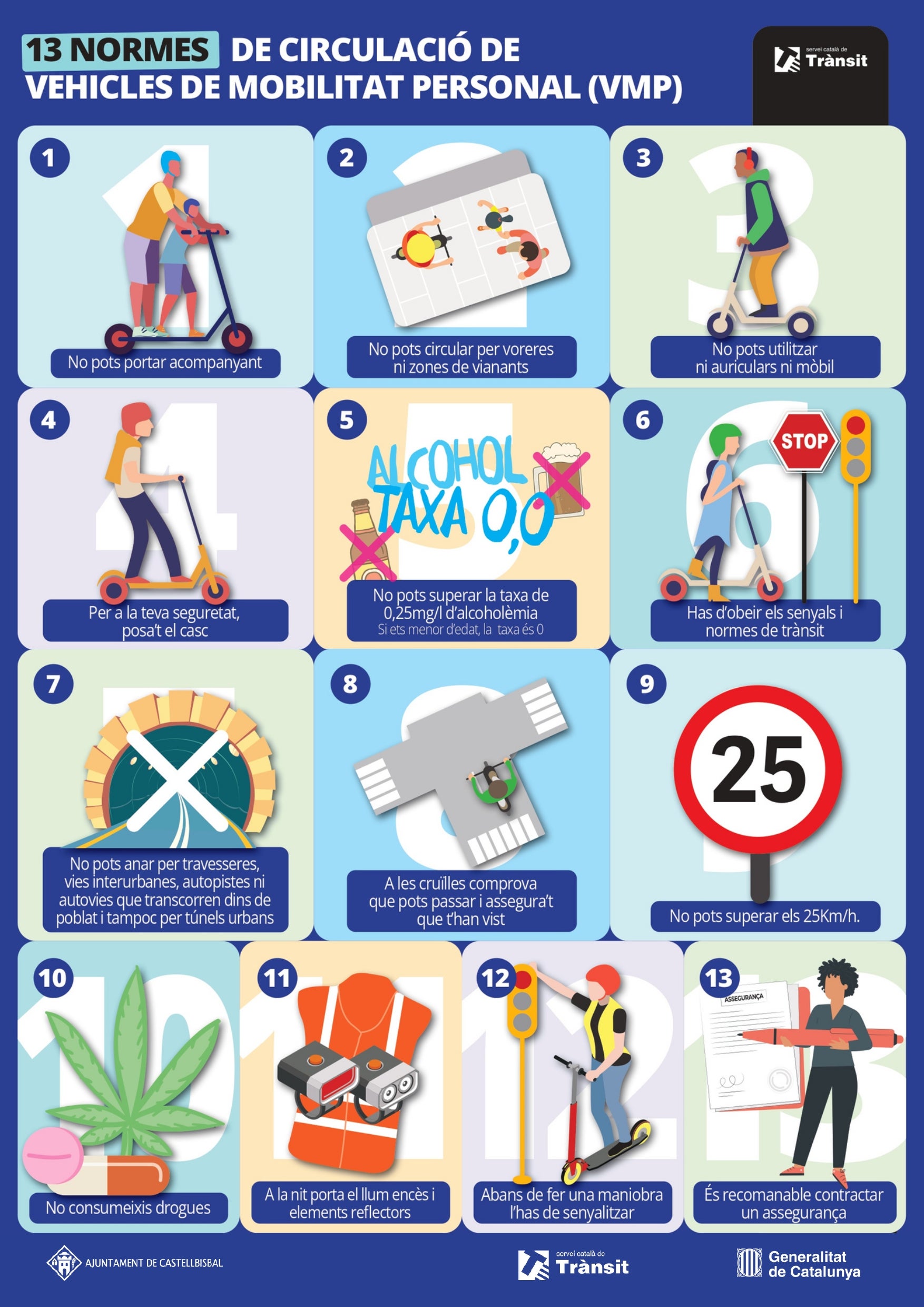 Des de l’Ajuntament de Castellbisbal destaquen un total de 13 normes de circulació dels patinets elèctrics i els Vehicles de Mobilitat Personal (VMP). Entre les principals que cal recordar, trobem que l’edat mínima per a conduir un patinet elèctric són els 14 anys i que està prohibit circular a una velocitat superior als 25 km/h. Altres normes a tenir en compte són:
