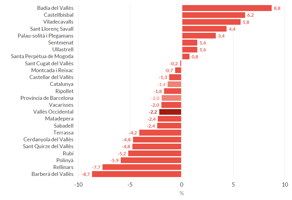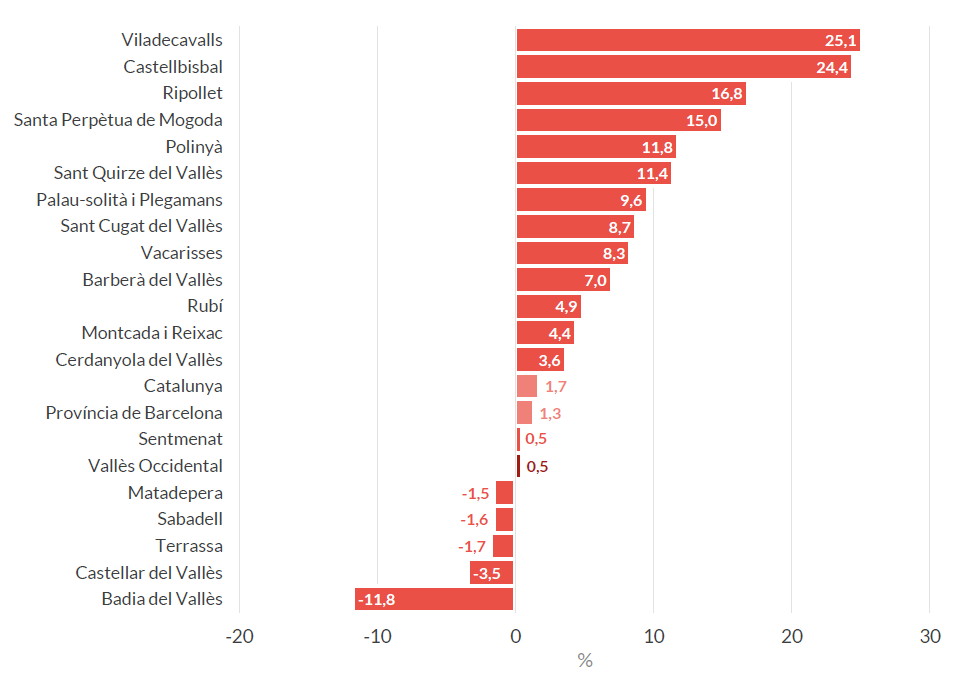 A Castellbisbal, la variació anual en el preu de compravenda d’habitatge respecte de l’any 2020 va ser d’un 24,4%, situant-se en la segona posició en el rànquing de municipis de la comarca amb major variació interanual, només superat per Viladecavalls.