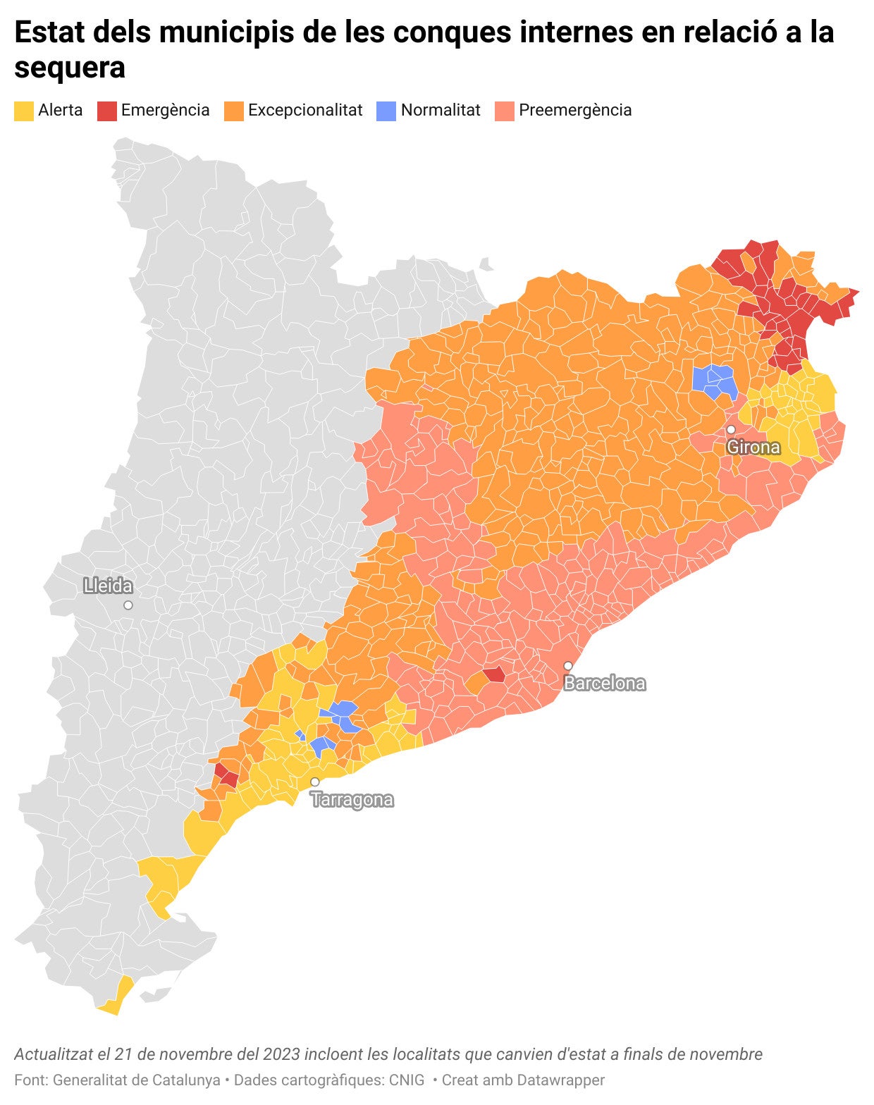 El govern de la Generalitat declararà aquest dimarts, 21 de novembre, l’estat de preemergència per sequera al sistema Ter-Llobregat, que aplega uns sis milions de persones. Es tracta d’un nou estadi de transició entre l’actual estat d’excepcionalitat i el d’emergència i permetrà intensificar algunes mesures per reduir el consum d’aigua davant la manca de pluges a tot el territori.