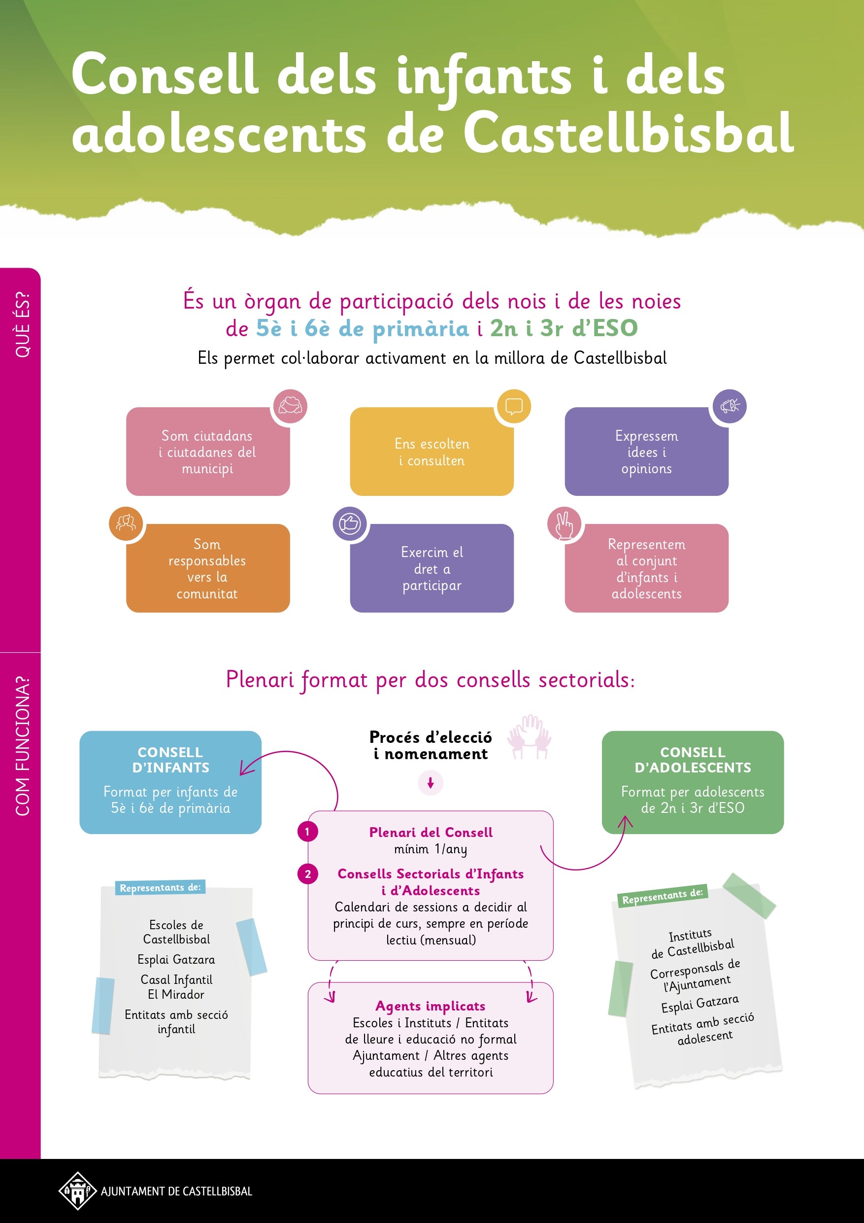 Està format per dos consells sectorials: D’una banda, el d’Infants l’integren alumnes de cinquè i sisè de primària de les escoles de Castellbisbal, l’esplai Gatzara, el casal infantil El Mirador i entitats amb secció infantil. D’altra banda, el Consell d’Adolescents és format per alumnes de segon i tercer d’ESO dels instituts de Castellbisbal, l’esplai Gatzara, entitats amb secció adolescent i corresponsals de l’Ajuntament.