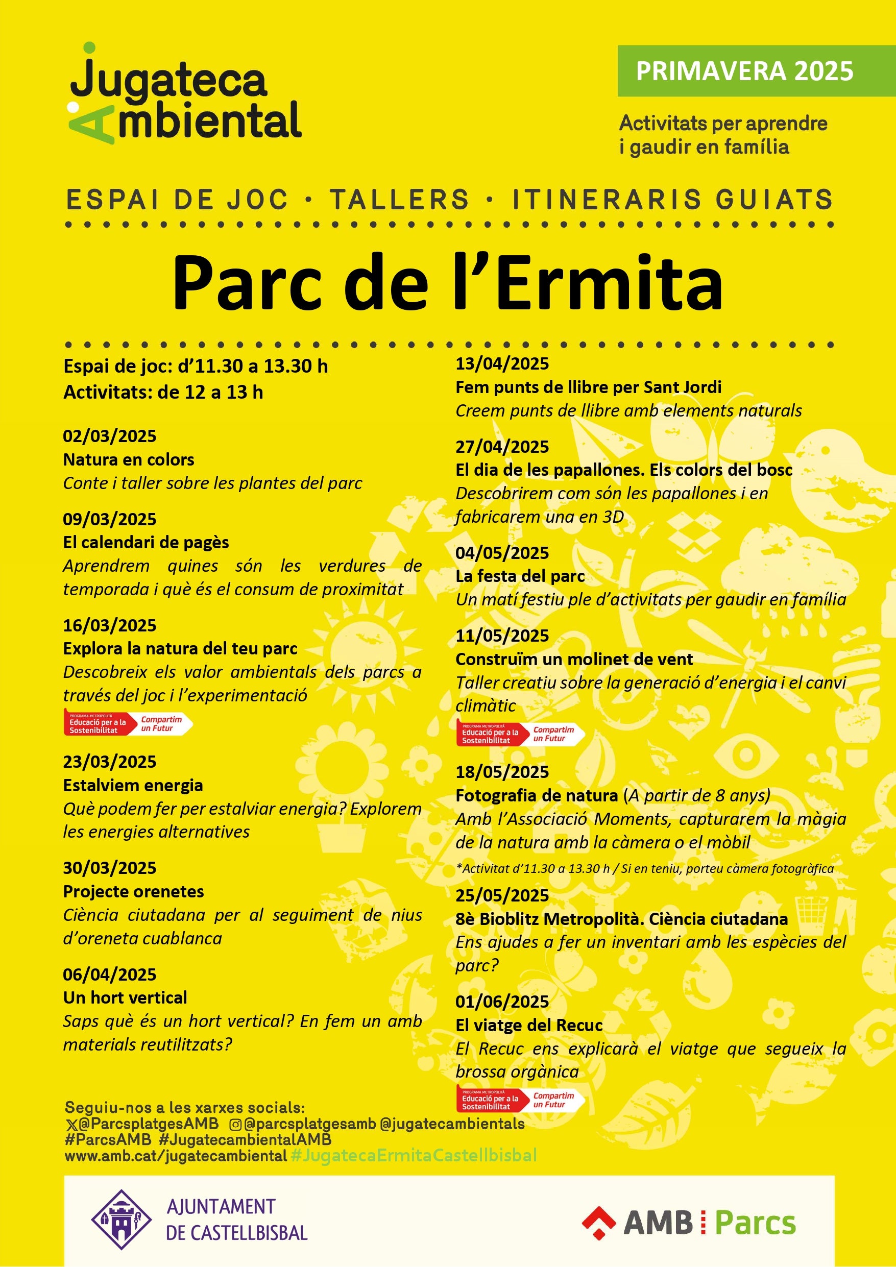 La Jugatecambiental és un projecte de l’Àrea Metropolitana de Barcelona (AMB) coordinat amb l’Ajuntament. Totes les activitats són gratuïtes i no requereixen inscripció prèvia. Es fan els diumenges al matí al parc de l’Ermita, de 12.00 a 13.00 hores, i es complementen amb un espai de joc familiar entre les 11.30 i les 13.30 hores. El calendari d’activitats finalitzarà l’1 de juny amb un taller per evitar el malbaratament alimentari i descobrir en què es converteix la brossa orgànica quan la separem correctament. Podeu trobar la programació completa en el següent enllaç.