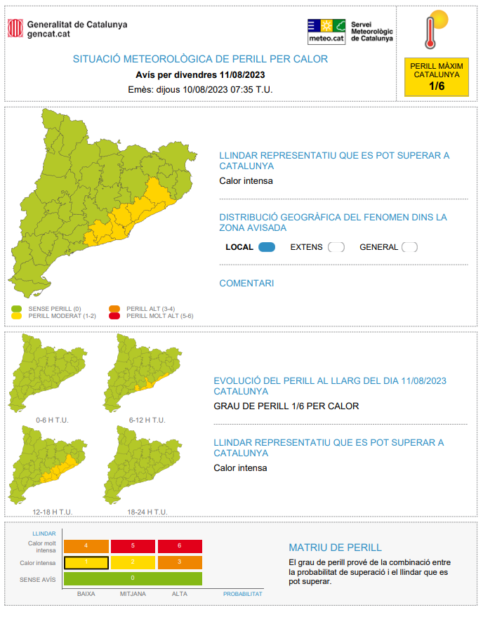 L’avís per calor del Servei Meteorològic de Catalunya va començar aquest dimecres i s’allargarà fins divendres. A Castellbisbal, l’alerta per altes temperatures no arribarà fins divendres, dia 11 d’agost. Especialment preocupant serà a partir de les dotze del migdia i fins a les sis de la tarda. En les hores prèvies i posteriors s’espera que el termòmetre continuï elevat però no tant. El grau de perill és moderat, d’1 sobre 6, tot i així s’indica que l’episodi es pot anomenar de “calor intensa”.
