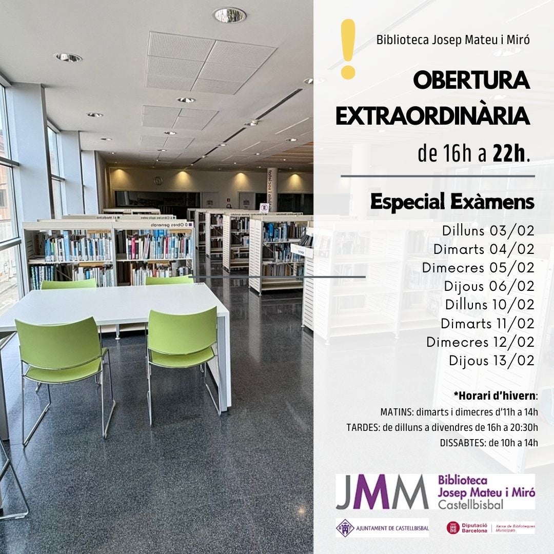 La Biblioteca Josep Mateu i Miró de Castellbisbal tornarà a ampliar el seu horari durant el període d’exàmens. Així doncs, enguany aquest espai públic romandrà obert fins a les 22:00 hores durant l’època d’exàmens i oferirà una sala d’estudi.
