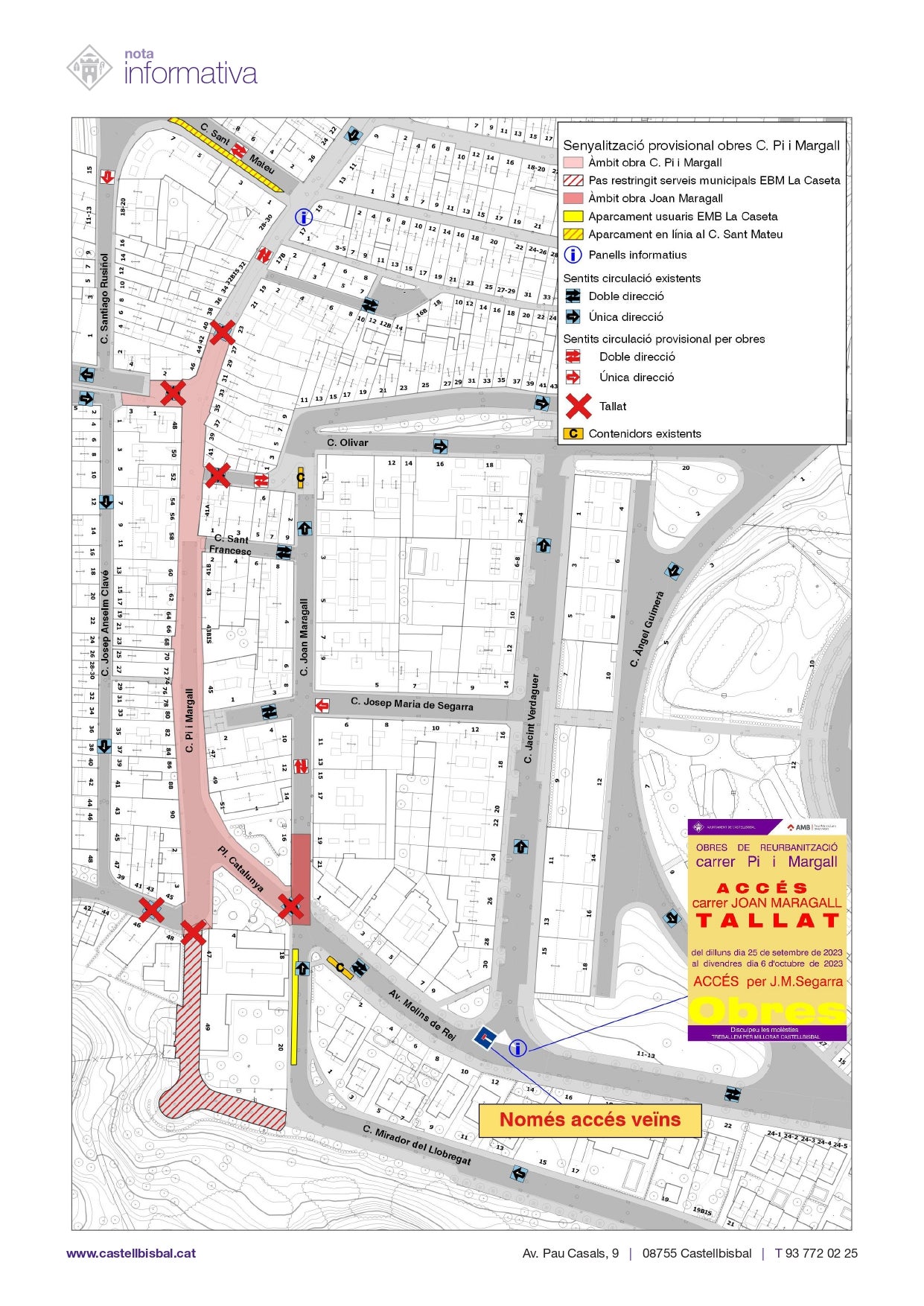 Segons ha informat l’ajuntament de Castellbisbal, aquesta nova afectació a la circulació és conseqüència de les obres que s’estan realitzant al carrer Pi i Maragall. D’aquesta manera, les pròximes dues setmanes es duran a terme tasques de connexió al clavegueram del carrer Joan Maragall i, per tant, la circulació de vehicles quedarà prohibida.