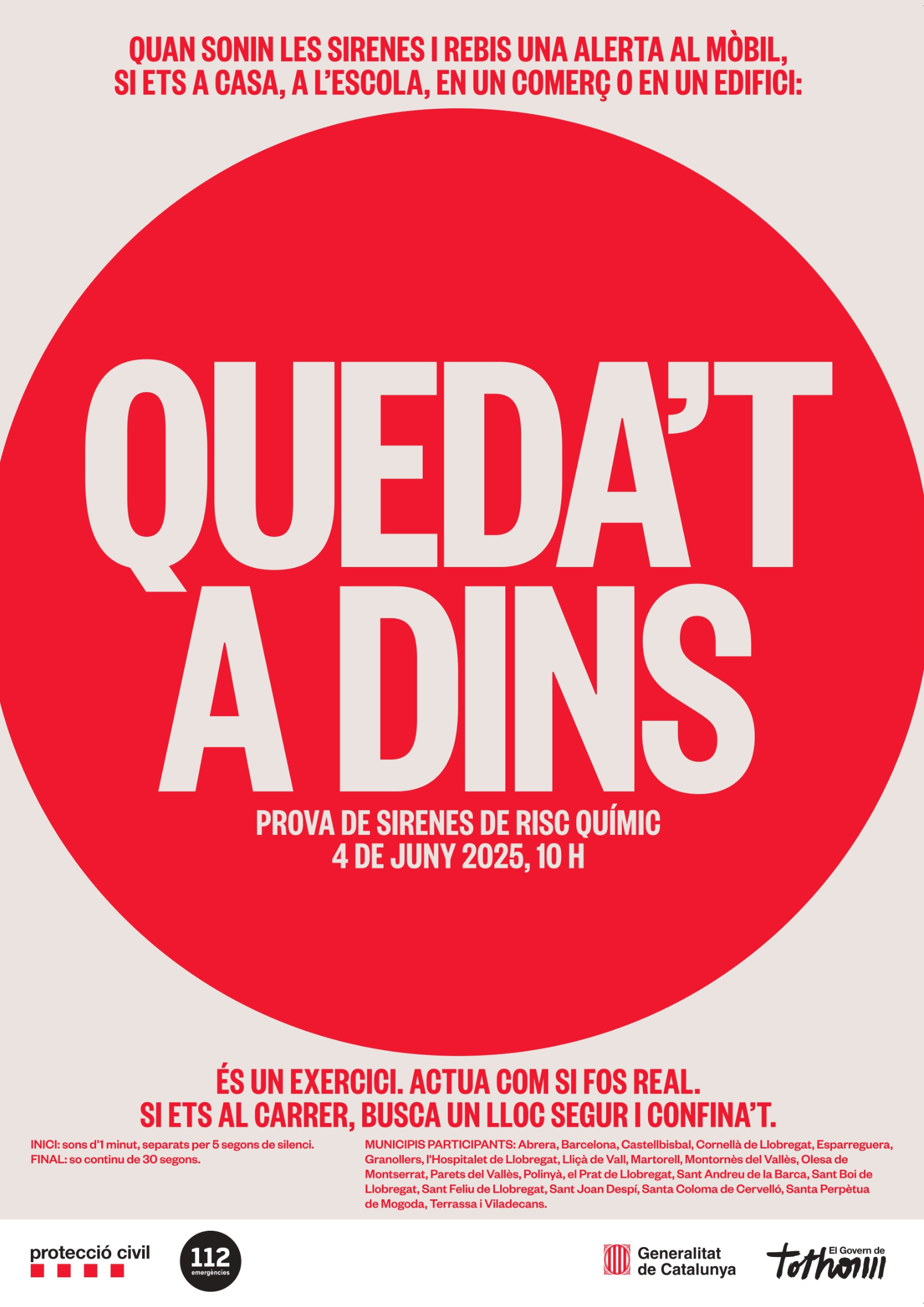 Dimecres de la setmana vinent, dia 4 de juny, a les 10:00 hores, la Direcció General de Protecció Civil de la Generalitat de Catalunya farà una nova prova de sirenes per risc químic. L’objectiu és comprovar que les sirenes funcionen correctament, familiaritzar la població amb els sons d’avís i recordar que el confinament és la mesura d’autoprotecció en cas d’accident químic.