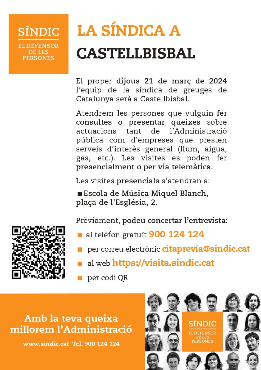 L’equip de la Síndica de Greuges de Catalunya visitarà Castellbisbal el dijous 21 de març del 2024. L’objectiu d’aquesta jornada és que la ciutadania del municipi pugui fer consultes i presentar totes les queixes que tinguin envers les administracions públiques i les empreses que presten servei d’interès general; com aigua, llum o gas.