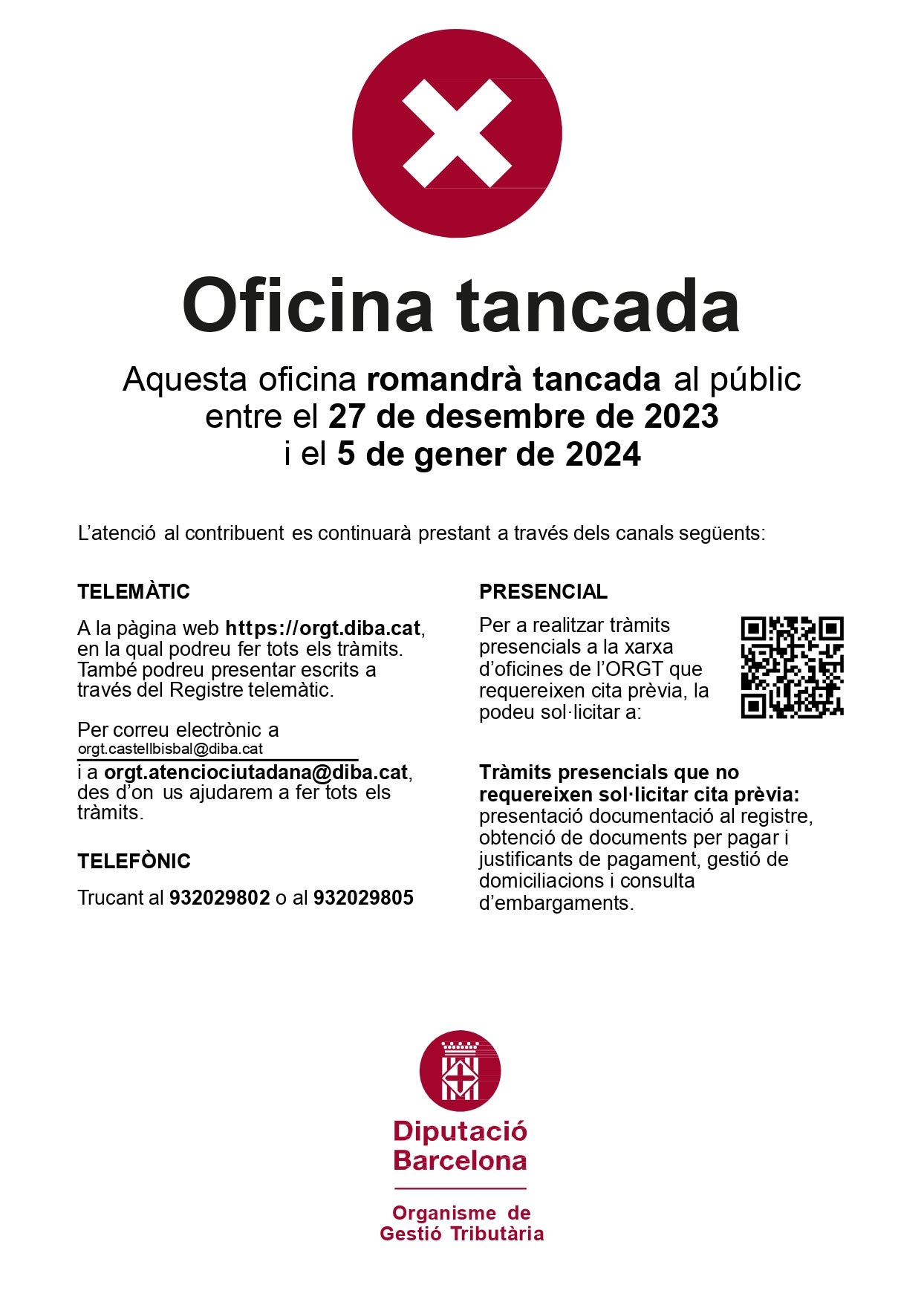 L’Ajuntament de Castellbisbal ha informat a través del seu compte oficial de Twitter que l’Oficina de Gestió i Recaptació Tributària de la Diputació de Barcelona al municipi, situada a l’Avinguda Pau Casals número 9, romandrà tancada del 27 de desembre al 5 de gener del 2024.