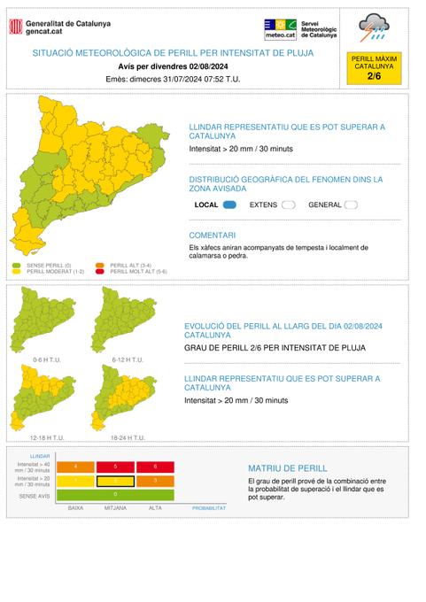 El llindar representatiu que es pot superar és de 20 mm en 30 minuts, i no es descarta que les precipitacions vagin acompanyades localment de calamarsa i pedra. Cal dir que el nivell de perill al llarg del dia és moderat (de 2 sobre 6, on sis seria la màxima intensitat).