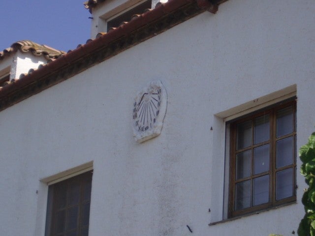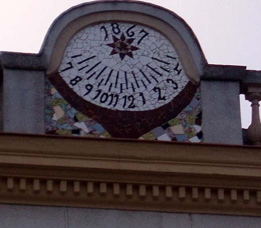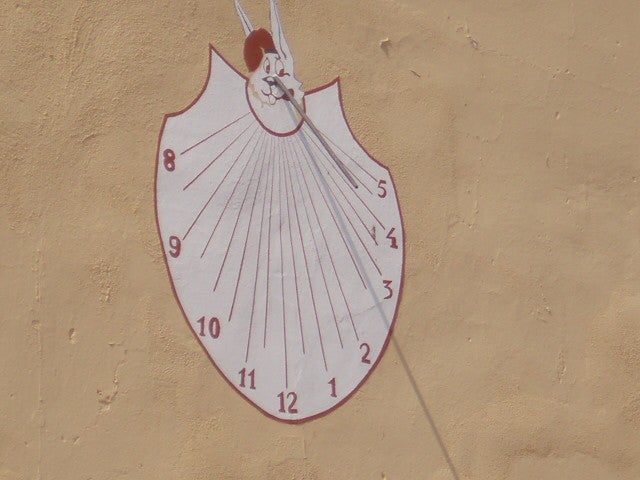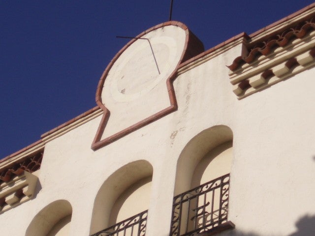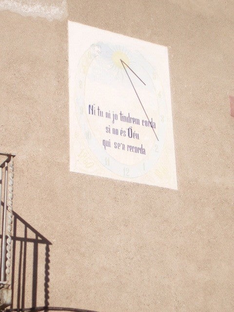 Rellotge amb forma ovalada emmarcat en una línia que sembla una lira. Hi podem llegir la inscripció següent: “Segueix com jo ton camí i tindràs bon fi”. També té inscrita la data de 1961.