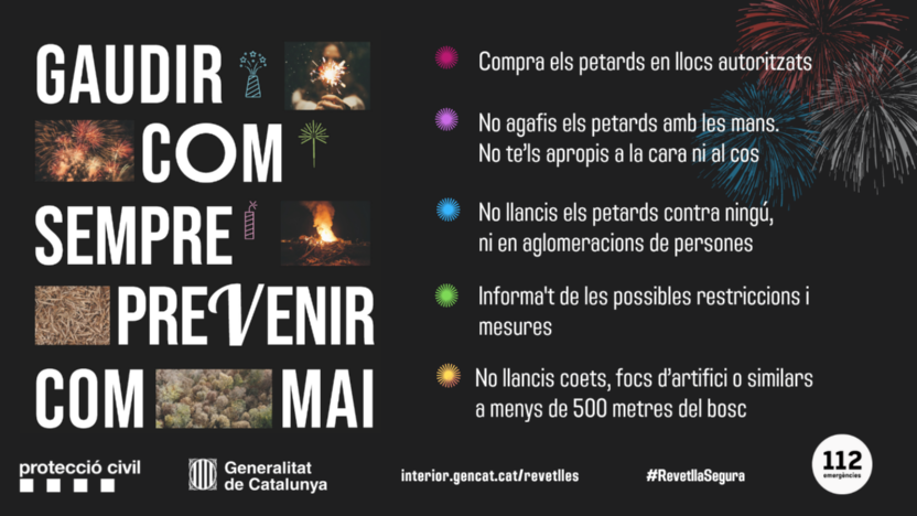 Sota el lema ‘Gaudir com sempre, prevenir com mai’, el gencat donat a conèixer cinc consells de seguretat prevenir accidents, especialment aquells relacionats amb la pirotècnia. Els punts són els següents: