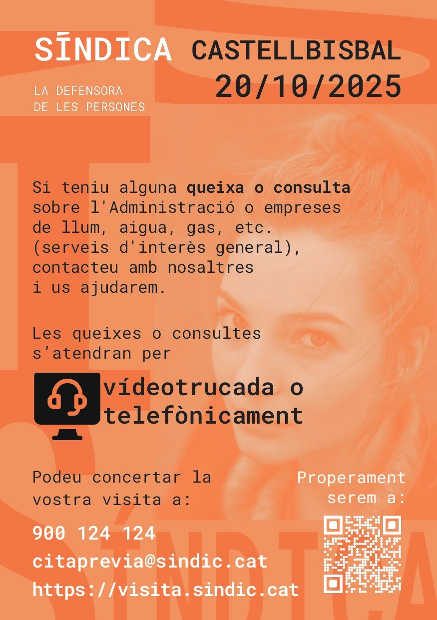 El pròxim dilluns 20 d’octubre, l’equip de la Síndica de Greuges de Catalunya atendrà les persones de Castellbisbal. Poden utilitzar aquest servei tots aquells veïns i veïnes del municipi que vulguin fer consultes o presentar queixes relacionades amb l’Administració pública o amb empreses que presten serveis d’interès general; com ara llum, aigua o gas.