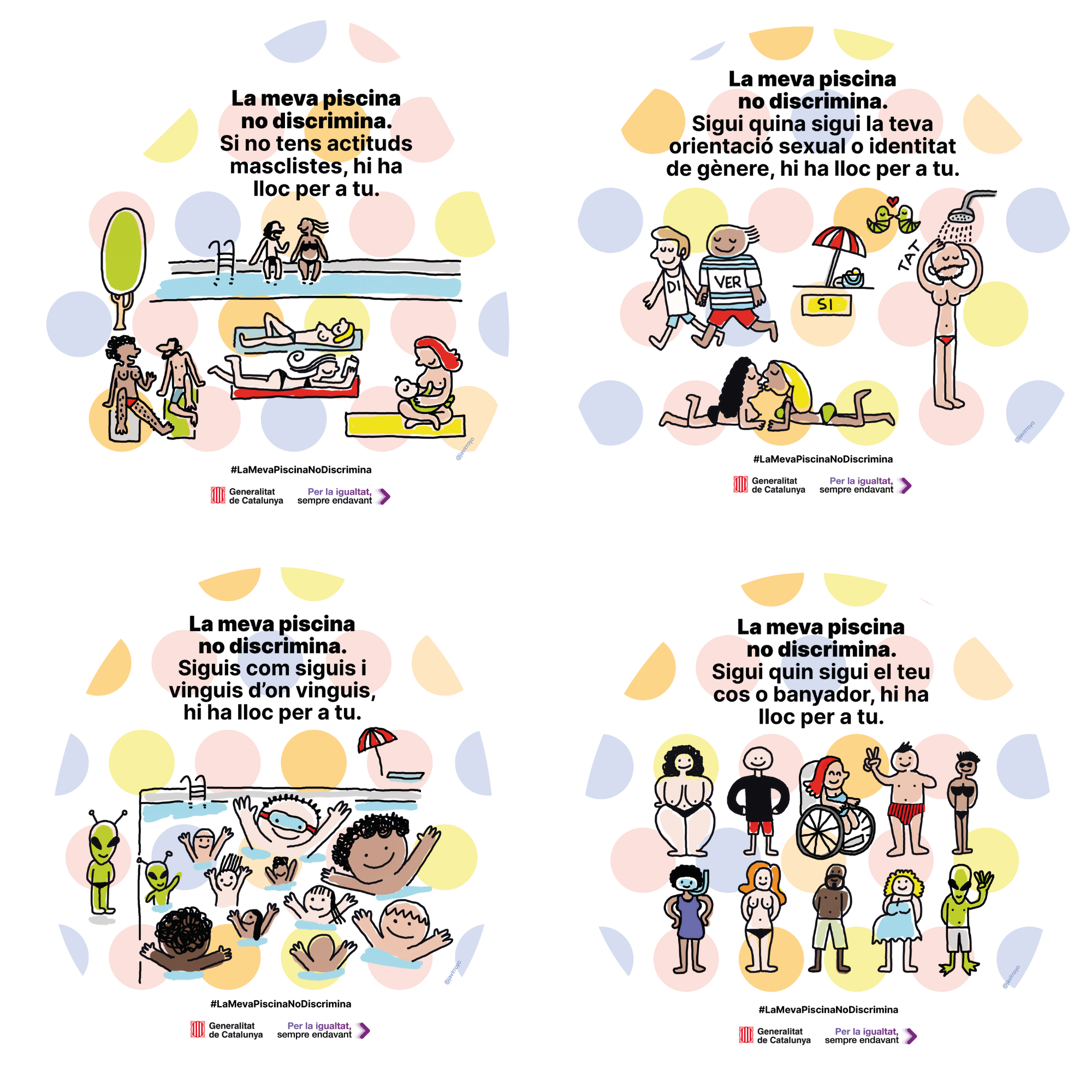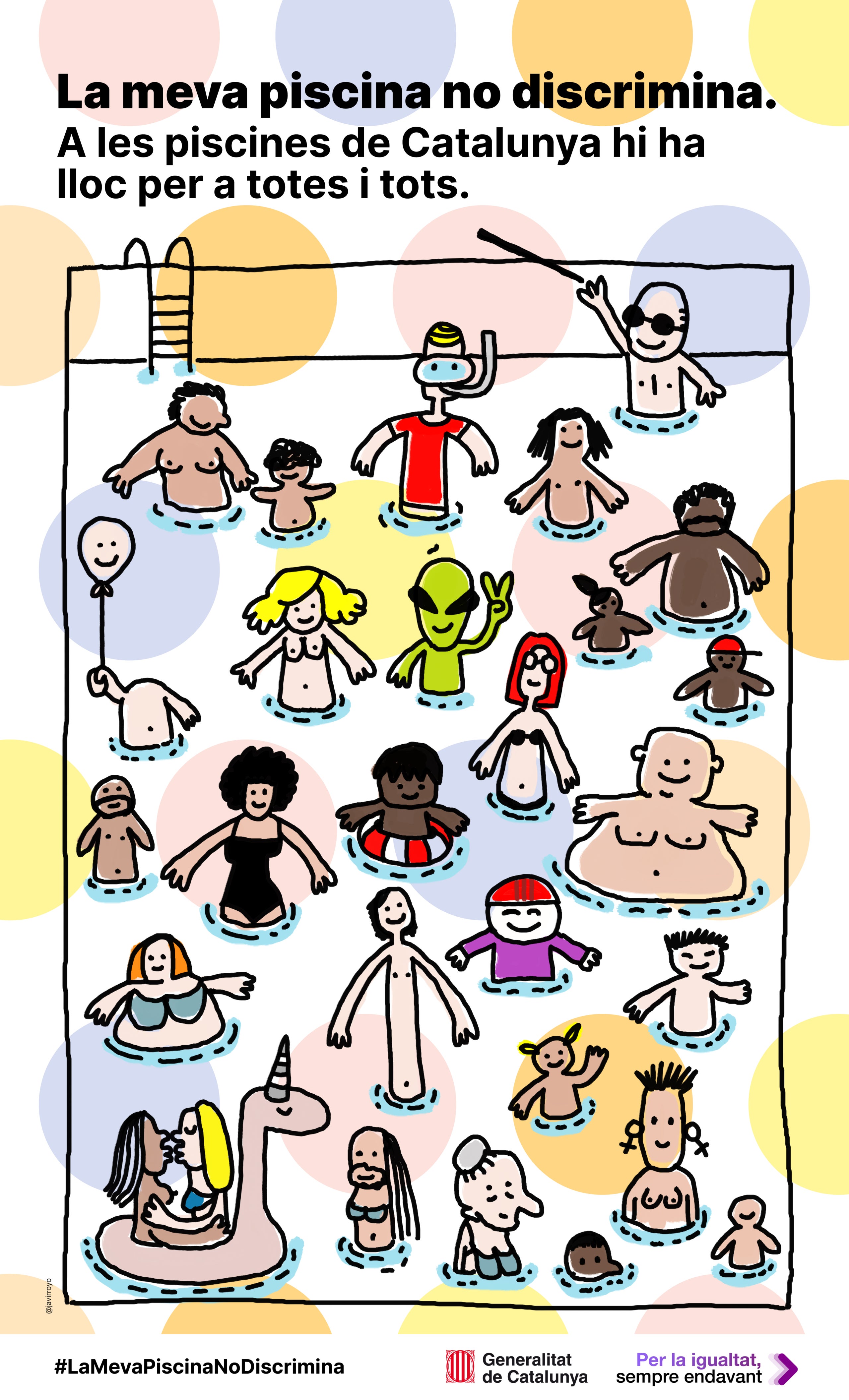 Sota el lema “La meva piscina no discrimina. A les piscines de Catalunya hi ha lloc per a totes i tots”, el departament d’Igualtat i Feminismes, amb la consellera Tània Verge al capdavant, ha presentat els materials gràfics il·lustrats pel dissenyador Javier Royo (@javirroyo a xarxes socials) que les piscines municipals catalanes lluiran durant aquests mesos d’estiu.